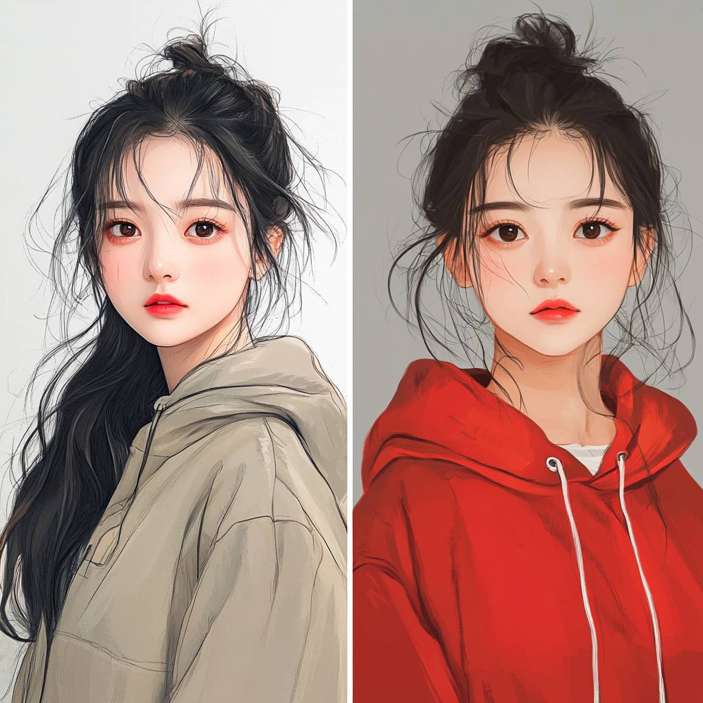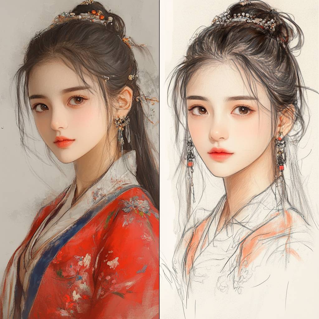 Beautiful Chinese girl, 18-year-old girl, full body, facial view, handsome, close-up, flat painting, minimalist vector style. (The painting on the left is a simple initial draft without any color, only a line drawing. The painting on the right is a brightly colored and very realistic colored work, depicting the same person on both sides of the painting.
