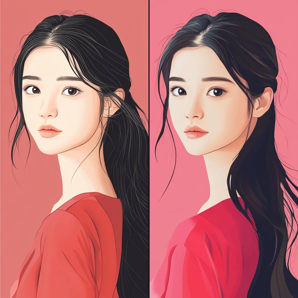 美しい中国の少女、18歳、全身、顔のクローズアップ、ハンサム、クローズアップ、フラットペインティング、ミニマリストベクタースタイル。(左側の絵は色のないシンプルな初期ドラフトで、線画だけです。右側の絵は明るい色でとてもリアルなカラーワークで、絵の両側に同じ人を描いています。)