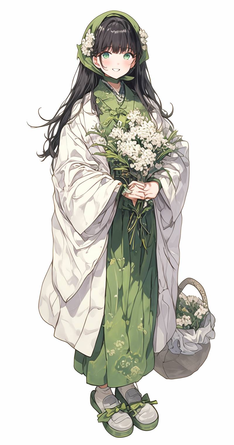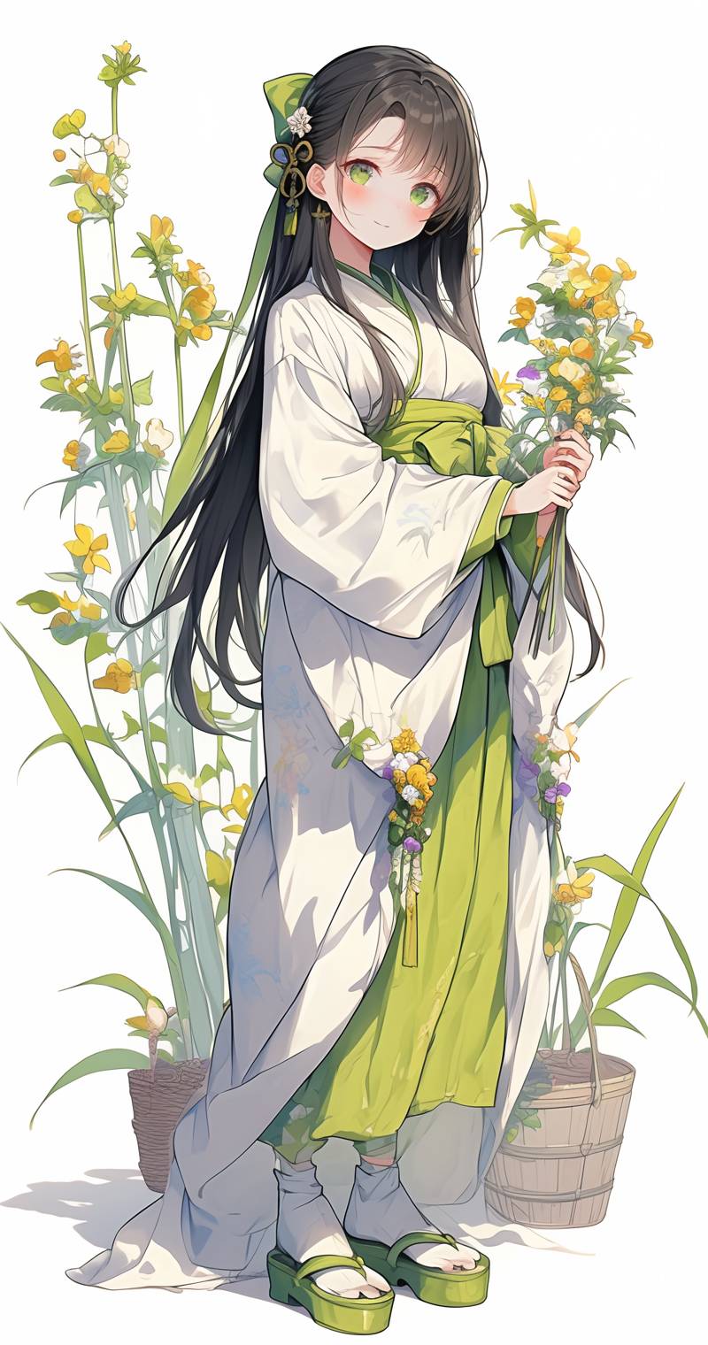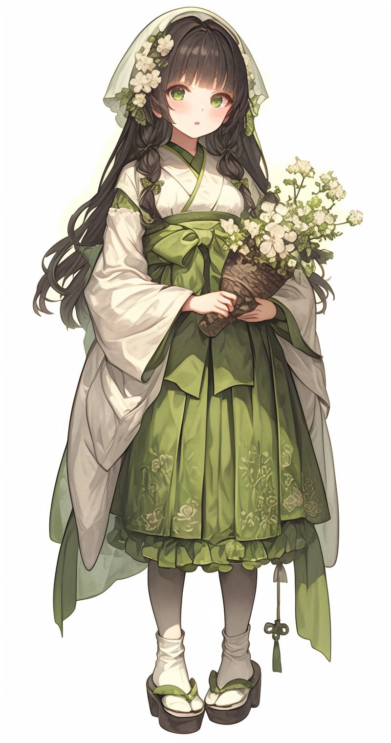 全身の縦型の絵、とてもかわいらしい女の子、長いストレートの黒い髪、緑の目、白と緑の長い着物、白いフリルのある緑の短いヘッドスカーフ、緑の下駄、花かごを持っている、白い背景。透明な色彩、かわいらしい絵のスタイル。