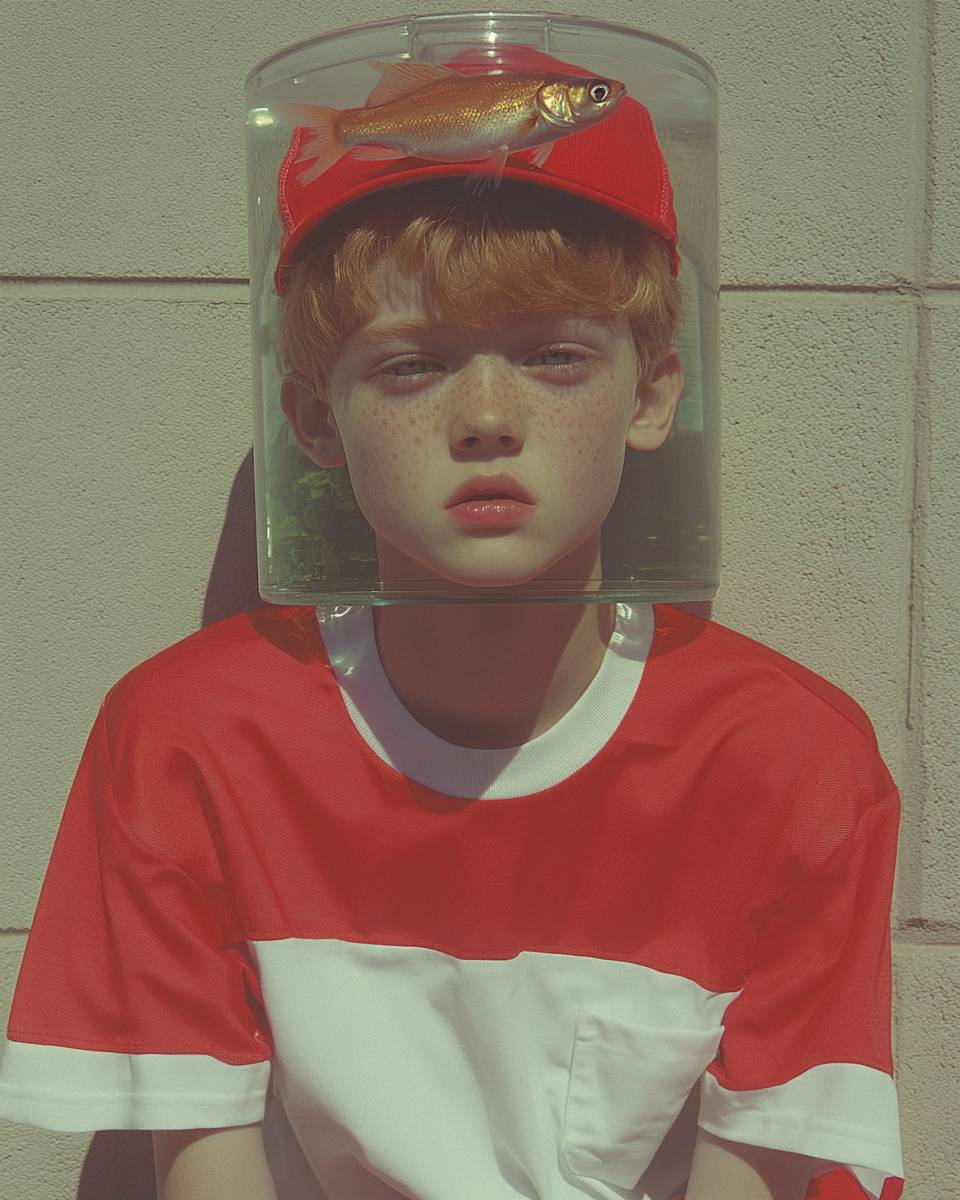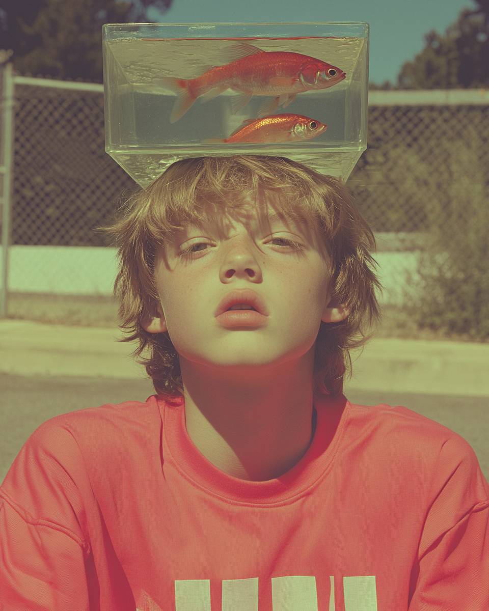 Output: Photography, intricate details, cinematic shot. Subject: Kid with a fish tank with fish in it on his head, looking disturbed, not facing the camera, sideview angle. Style subject: 12yo kid, summer clothes, vibrant colors. Background: empty streets, American suburbia around 1970s. Emphasizers: sunlight, OrangeCore, green color of fishtanks, GreenCore. Camera: Shot on iPhone 15 Max, wide nagle mode --chaos 25 --ar 4:5 --style raw --sref <https://s.mj.run/H0CLUdym6vc> <https://s.mj.run/IIDoFpgdjjY> <https://s.mj.run/YL0uz5rZNfo> --personalize wqtivou --stylize 1000 --v 6.1