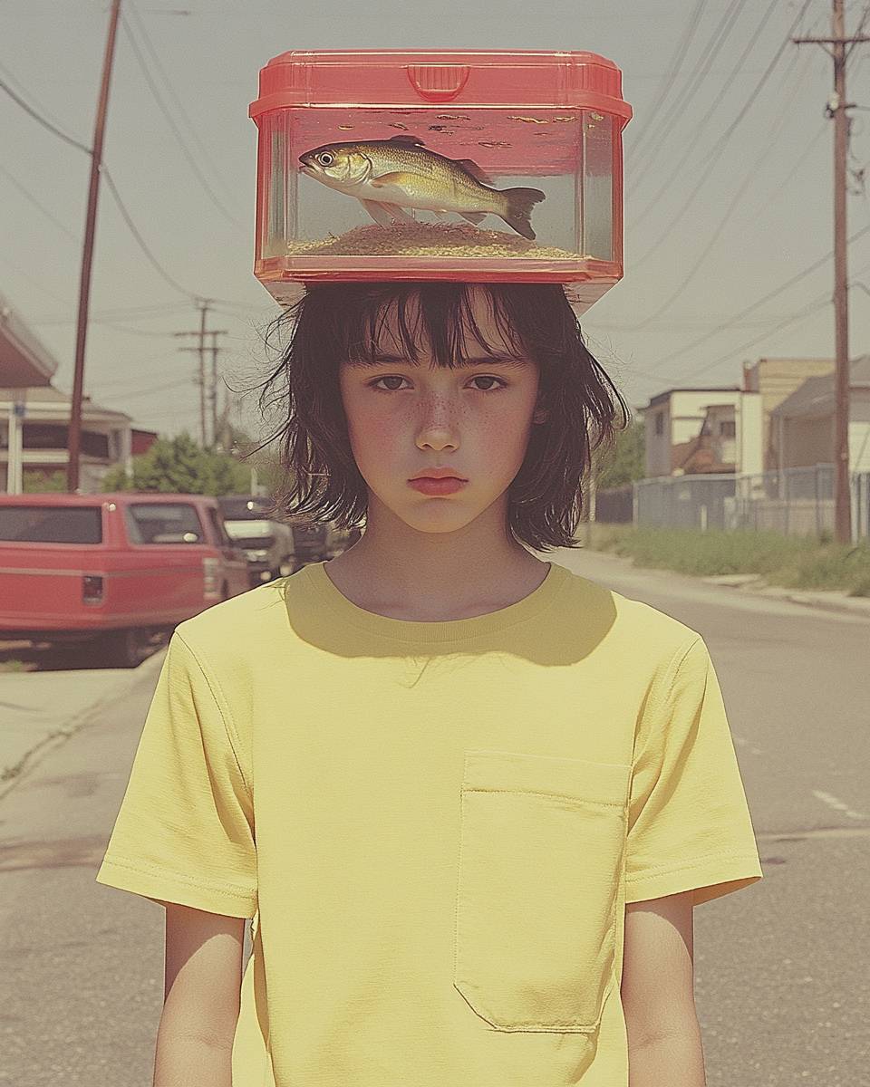 写真、複雑なディテール、映画的なショット。テーマ:頭に魚が入った水槽をのせた子供、不安そうにカメラを向いていない、横からのアングル。スタイルテーマ:12歳の子供、夏の服、鮮やかな色。背景:1970年代のアメリカの郊外の空っぽの通り。強調要素:日光、オレンジコア、水槽の緑、グリーンコア。カメラ:iPhone 15 Maxで撮影、広角モード。