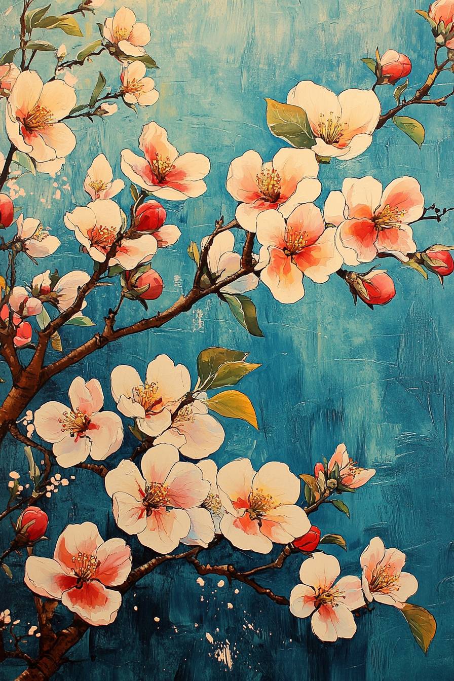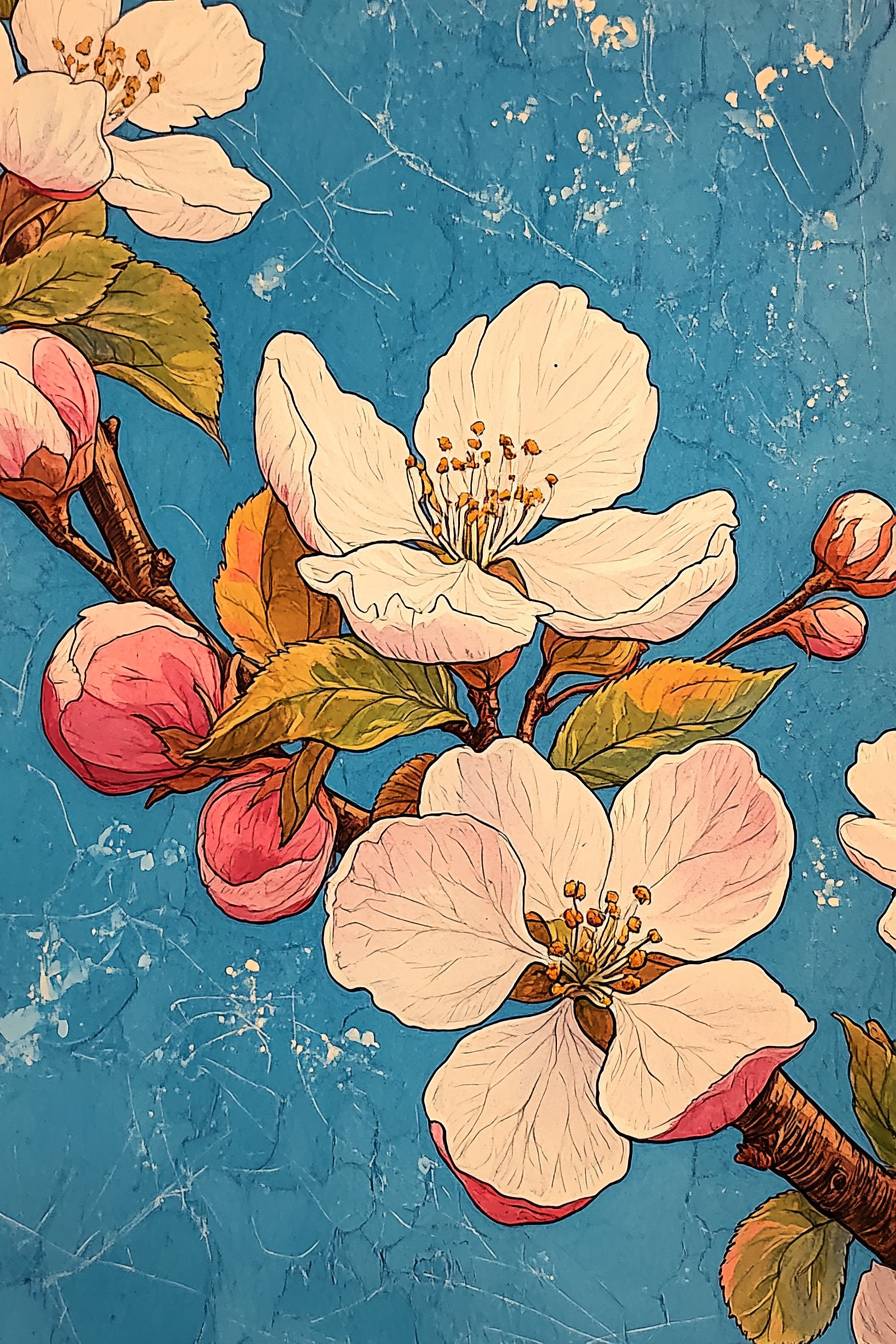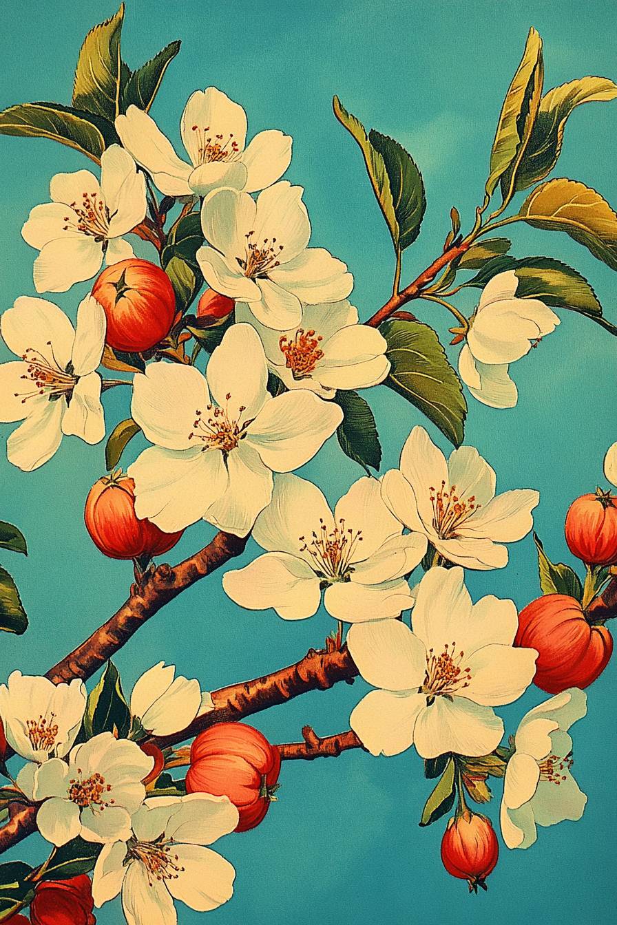 リンゴの orchard が花が咲いている絵、木には白、黄、ピンク、緑の葉があり、淡い青空の枝がかすかに見えています。