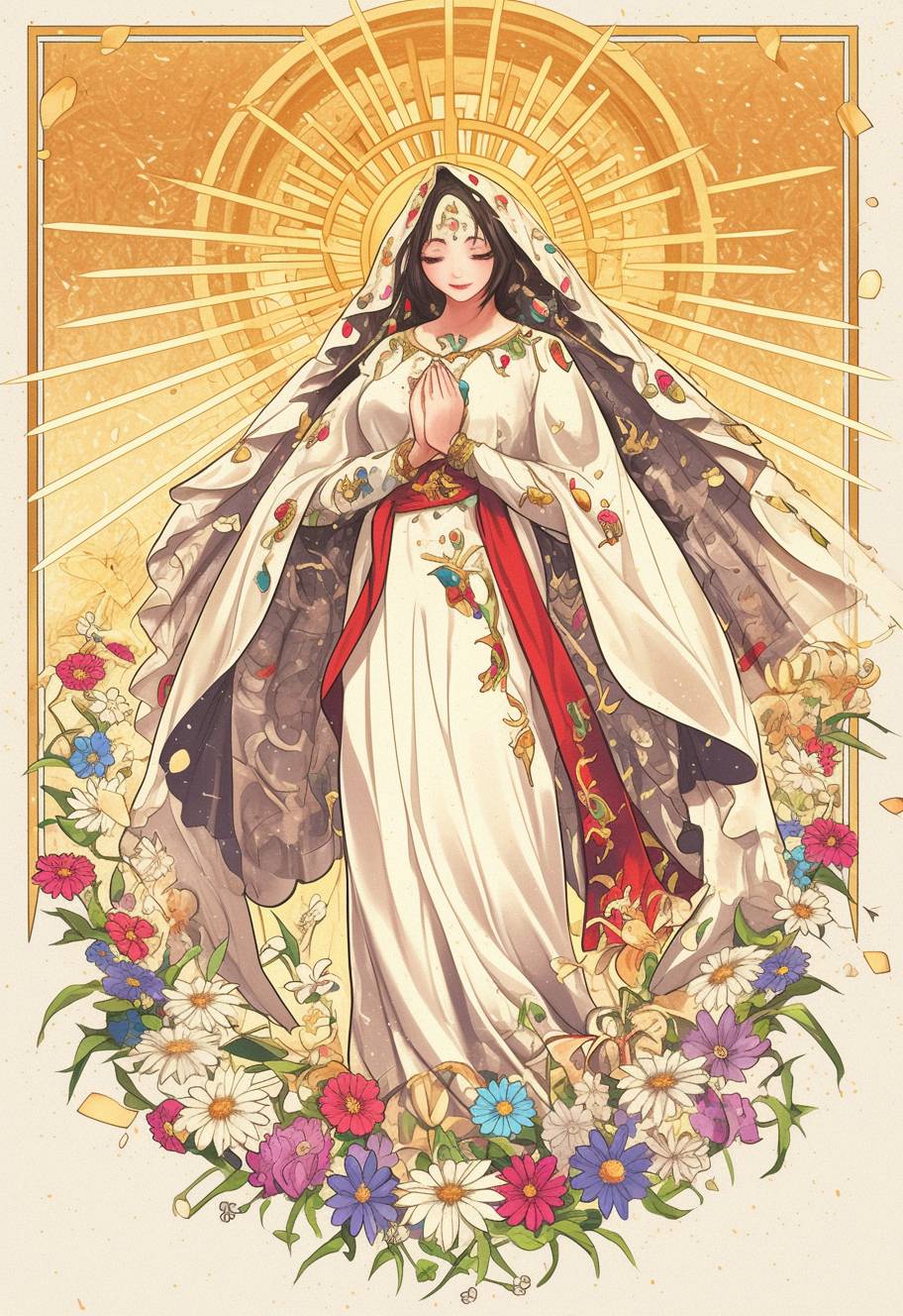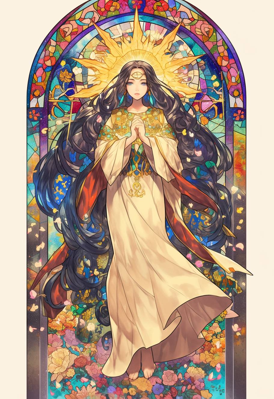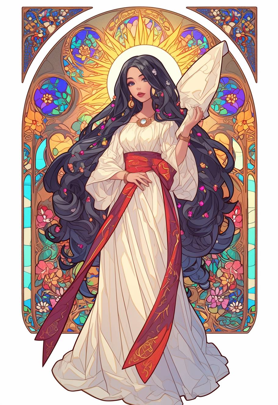 美しい全身のアニメの女神が太陽を持ち、白いローブに赤いサッシュを着て、長い黒髪と足元にカラフルな花々を囲んでいます。アートワークはステンドグラスのスタイルで、色鉛筆で紙に描かれ、ページの真ん中に孤立していて、背景は空白で、クリップアートのステッカースタイルで白い縁があります。