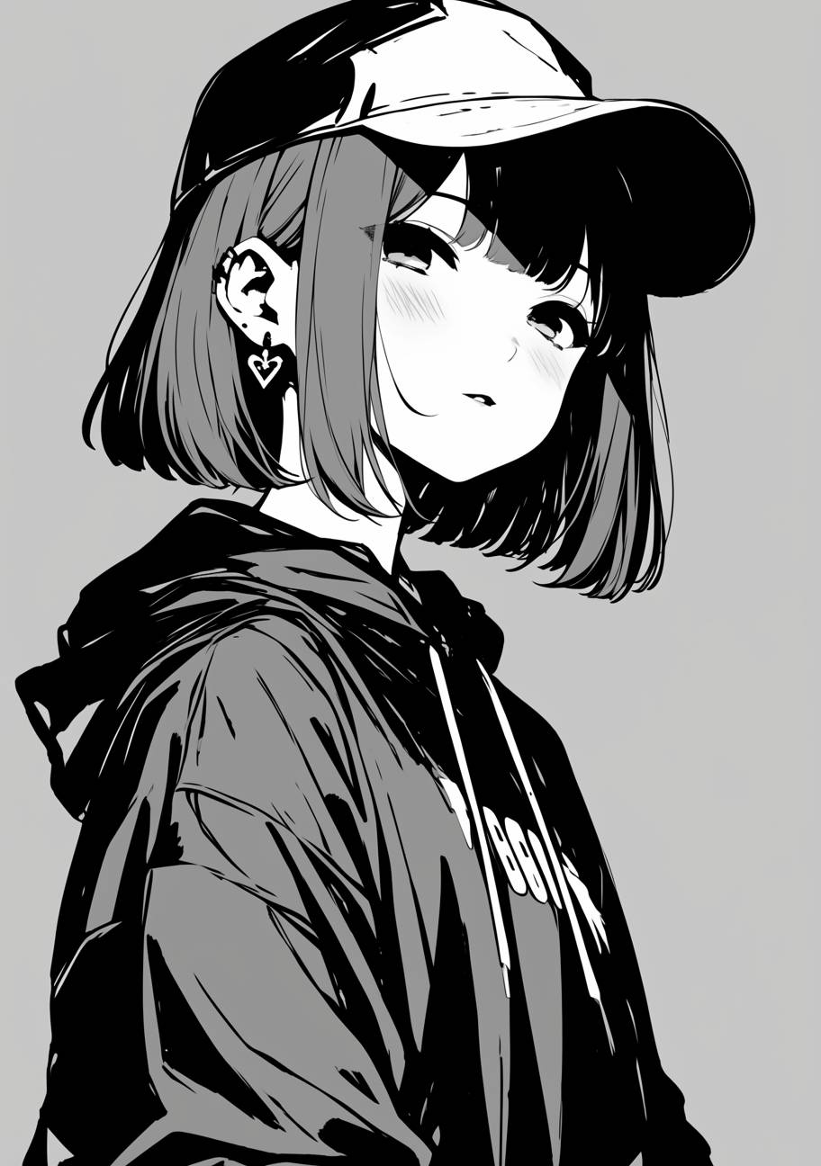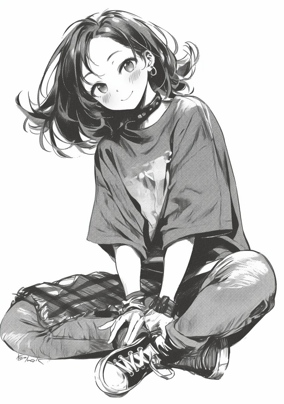 オルタナティブ・エモの服を着た2Dの女の子。ハーフボディのポートレートです。輪郭だけで、マンガスタイルの白黒で、ダイナミックなポーズ、けいおん!にインスパイアされたキャラクターデザイン。