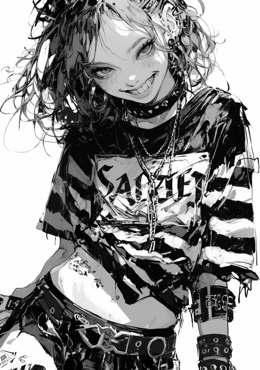 2D-girl wearing alt-emo clothes. It's a half-body portrait. outlines only in manga style black and white colors, dynamic pose, k-on inspired character design --ar 53:75 --stylize 400 --niji 6