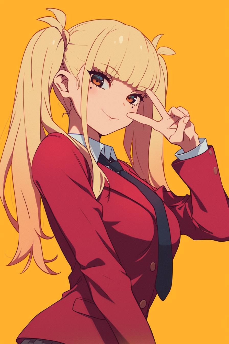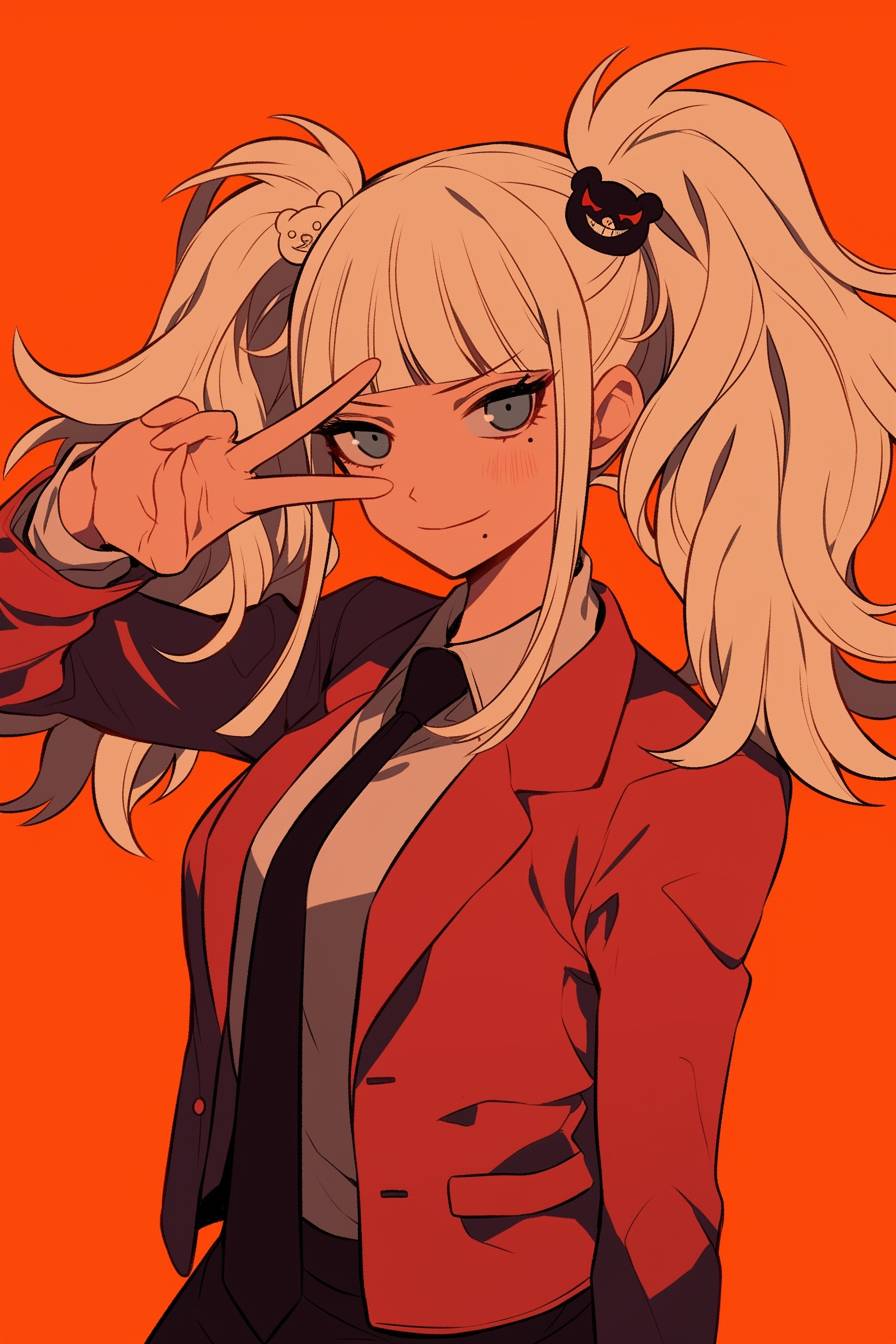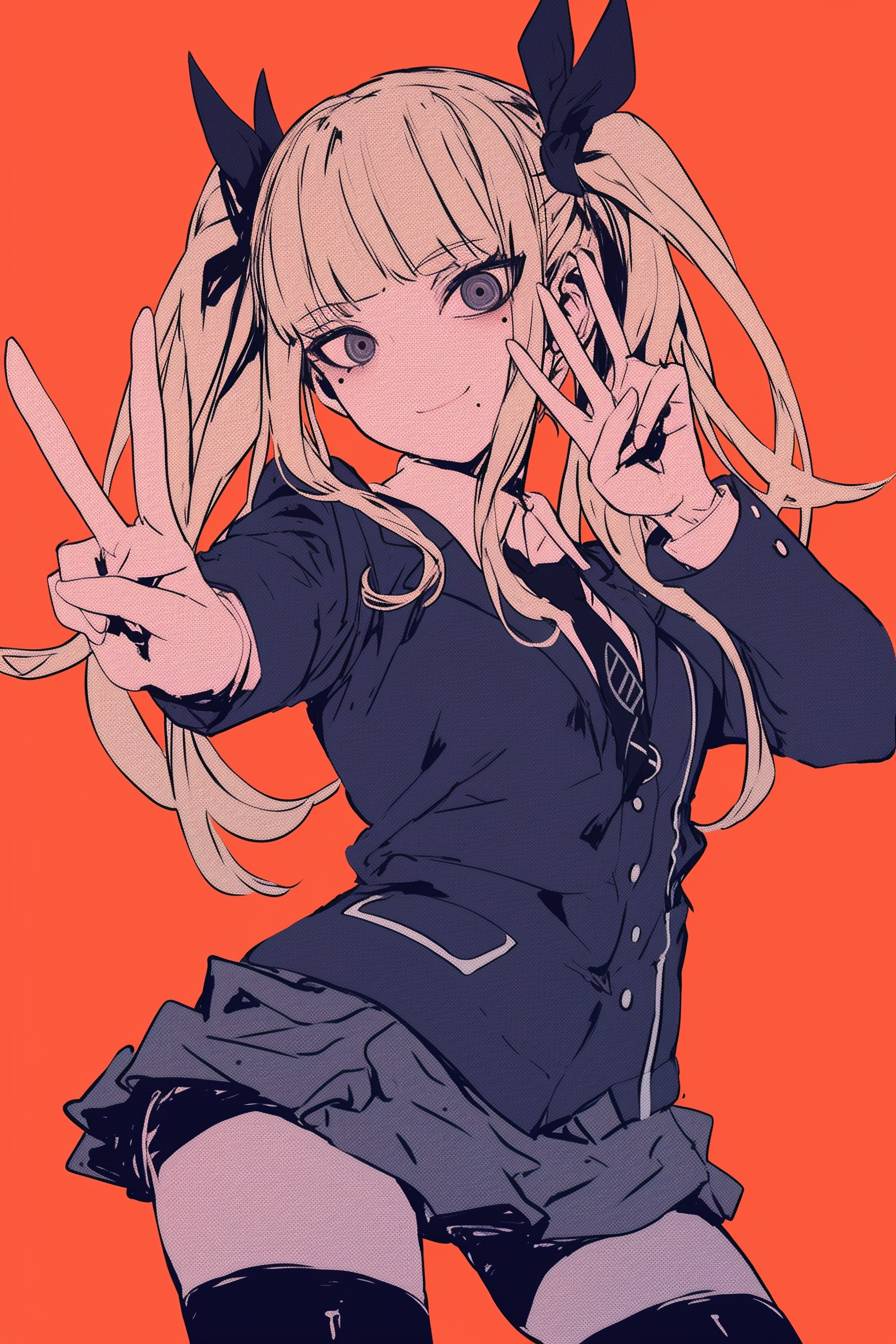 1 girl, fire works, standing, v sign, black ribbon, blonde hair, twintails, asymmetry blunt bangs, sidelocks, orange colored background, eyelashes, mole, smile, necktie, jacket, formal, black eyes, flat coloring, toon style --ar 2:3 --niji 6