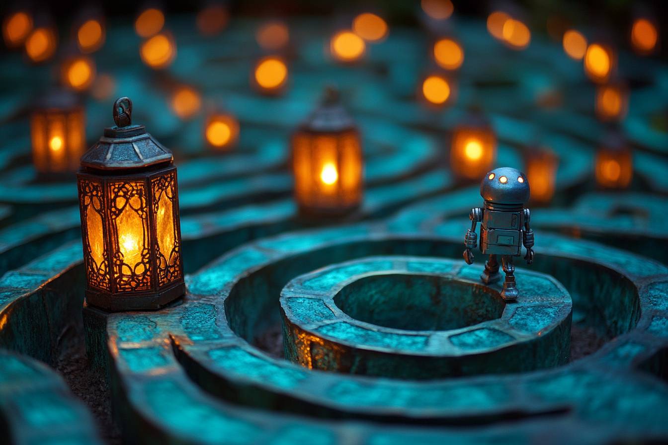 Within a sprawling bronze labyrinth, a tiny robot follows a trail of turquoise glowing lanterns, each light a guardian spirit leading the way to the heart of the maze, where ancient secrets await. --ar 3:2 --style raw --s 250