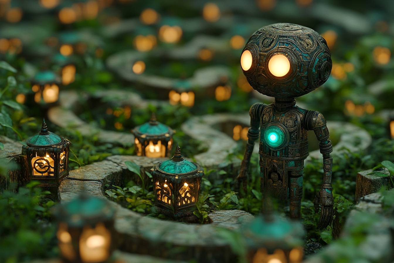 広大な銅製の迷宮の中で、小さなロボットが青緑色に光るランタンの道を進んでいます。各ランタンは迷路の中心へと導く守護霊であり、そこには古代の秘密が待っています。