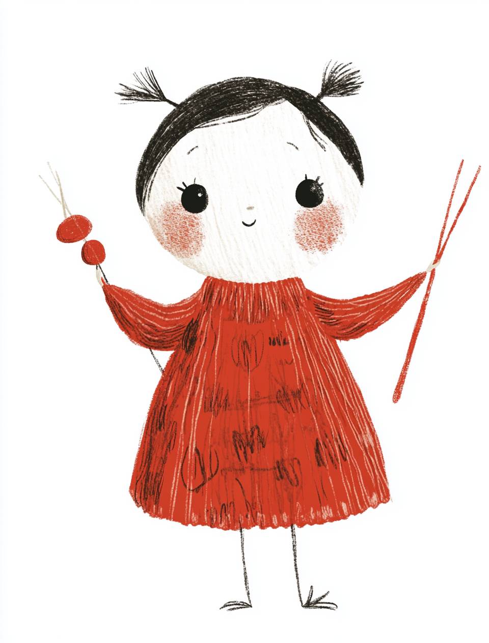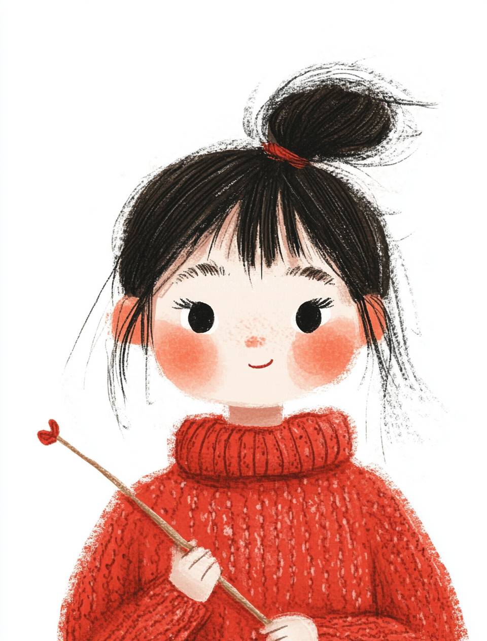 A red woolen sweater with knitting needles, an anthropomorphic knitted doll holding the end of one yarn and holding up two needle r in his hands. The background is white, style by Jon Klassen. A very simple drawing of a woman wearing all-red crocheting, simple lines, simple colors, simple details, simple shapes, simple shape. hair from Red yarn. She has eyes like scales, in the style of Milton Avery. Inflated design, cartoon character, vector illustration.The artwork is created using a fabric texture for depth, with bold lines that highlight its features --ar 97:128 --style raw --v 6.1