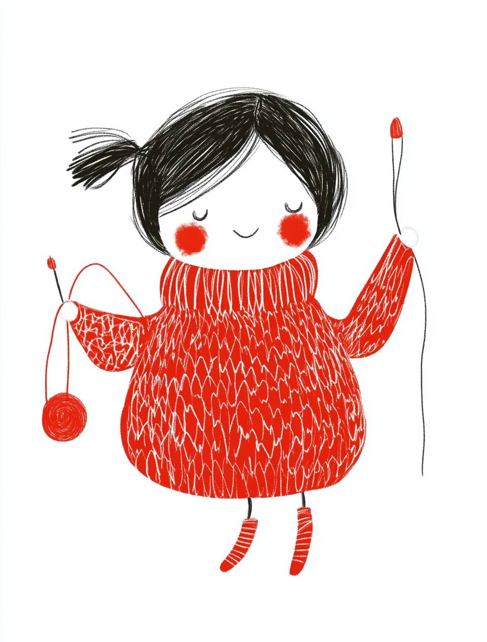 赤いウールのセーターと編み物用の針を持った擬人化された編みぐるみが、一本の毛糸の端を握り、両手で2本の針を持ち上げています。背景は白で、Jon Klassen風。全身赤のかぎ編みをしている女性の非常にシンプルな絵、シンプルな線、シンプルな色、シンプルな詳細、シンプルな形。髪は赤い毛糸でできています。彼女の目は鱗のようで、Milton Averyのスタイルです。膨らんだデザイン、カートゥーンキャラクター、ベクターイラスト。作品は深みを加えるために布の質感を使用し、特長を強調する太い線が使われています。