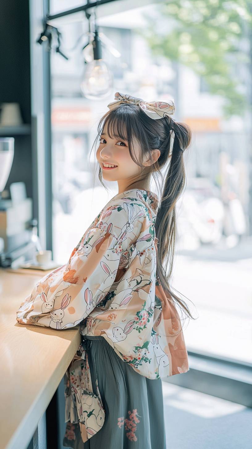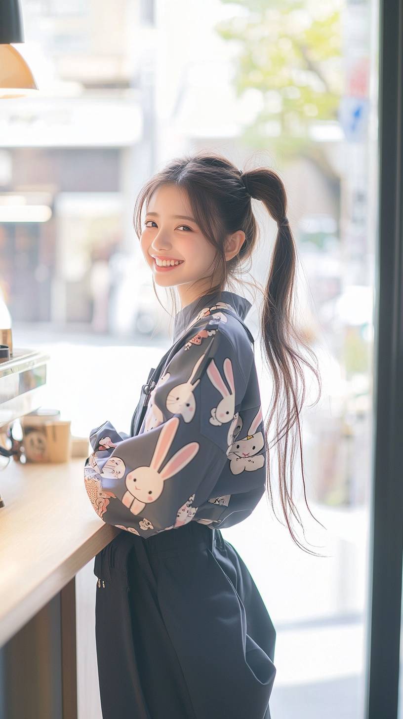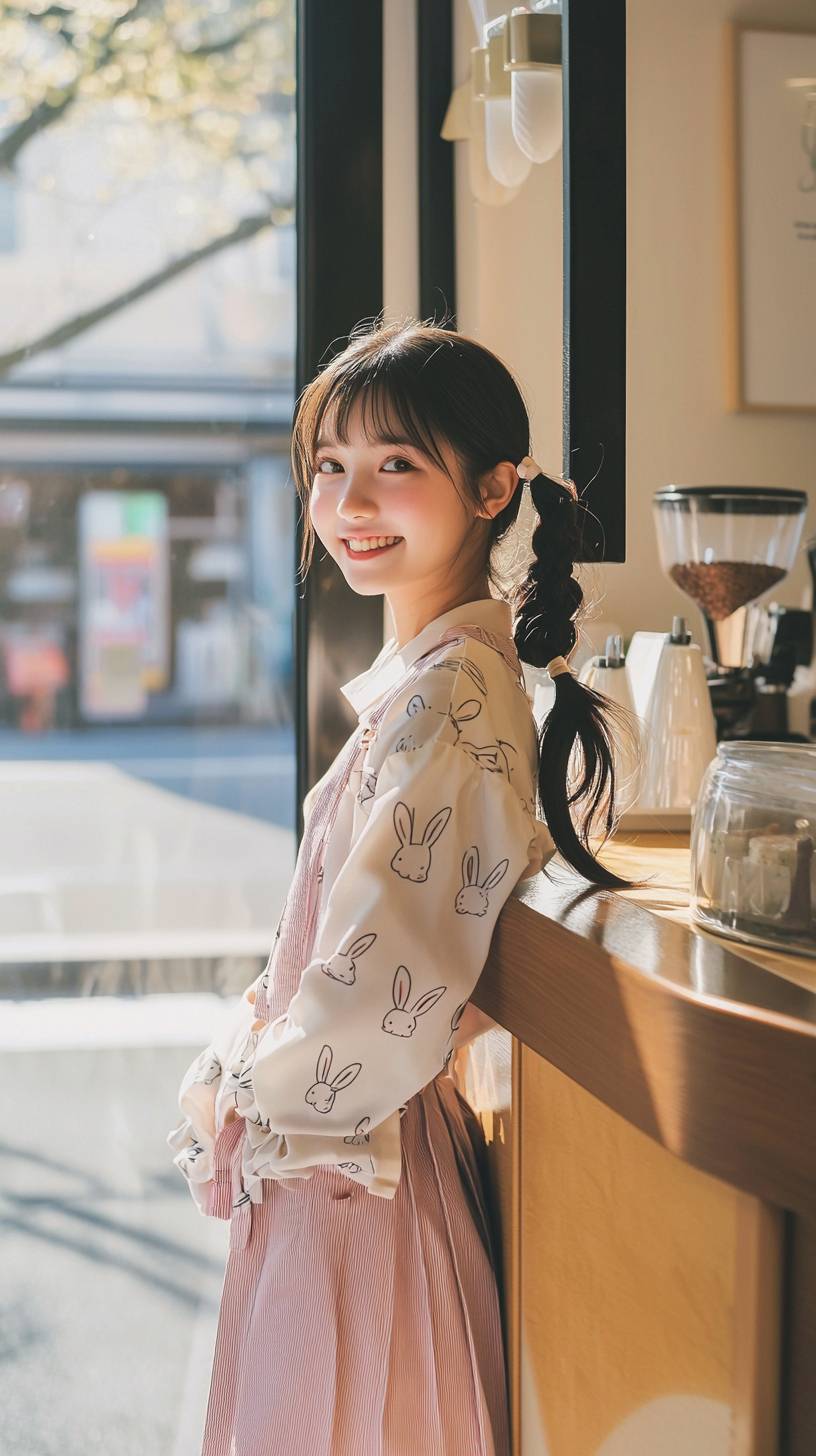 分割レベルのショット、富士フィルムGFX100S IIを使用、フォトリアリスティックで最高の芸術的品質、光とパステルトーンの魔法使いによる写真。フォトジェニックな20歳の日本の超可愛い女の子、トップモデル。代官山のカフェのカウンターにもたれかかり、ウサギの模様があしらわれたツインテールヘアスタイルが、振り向いて微笑むときに優しく揺れる。自然光が窓から流れ込み、彼女の新しいデザイナーコレクションを照らし、彼女の柔らかい表情は温かさと無邪気さに満ちていて、Instagramの美学を完璧に捉えている。