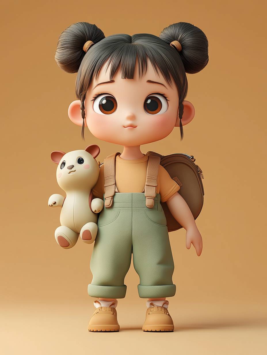 A cute little girl with big eyes, wearing light green and brown pants is carrying an animal-shaped shoulder bag on her back. She has two buns tied in pigtails hairstyle. Full body portrait with a solid color background in the style of Pixar. Blind box toy design in the three-dimensional cartoon character rendering sty#le with natural lighting and a clay material, at high resolution. --ar 3:4 --v 6.1