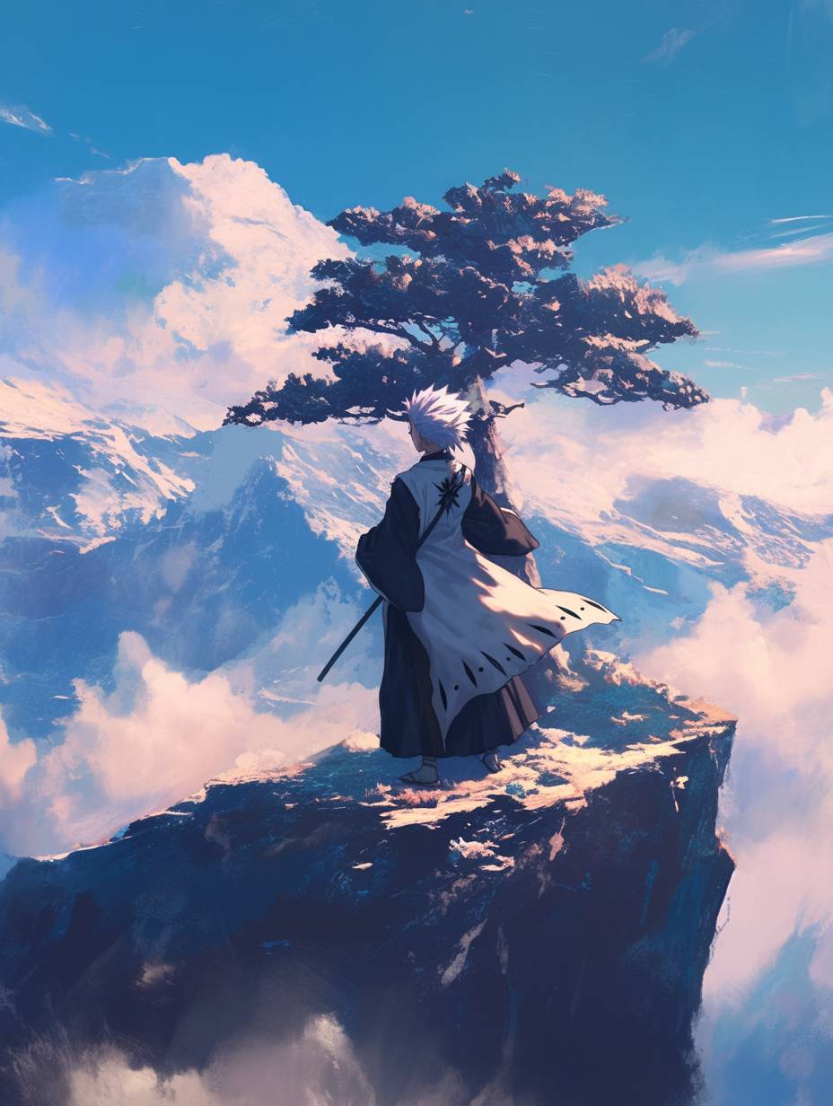 アニメ『ブリーチ』の市番谷冬獅郎が崖の上に立ち、美しい、没入感のある風景を宮崎駿スタイルで見つめている。