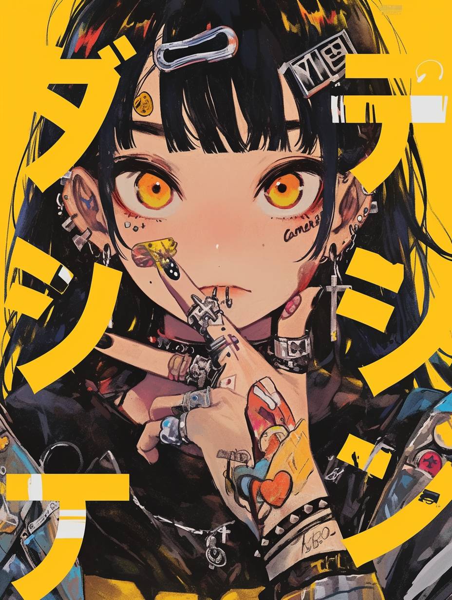 アニメ雑誌の表紙、現代的な服装を着た女の子、黄色の目、長い黒と黄色の髪、黄色の背景、カラフルなイラストを着ている高詳細で高解像度のアニメスタイル。