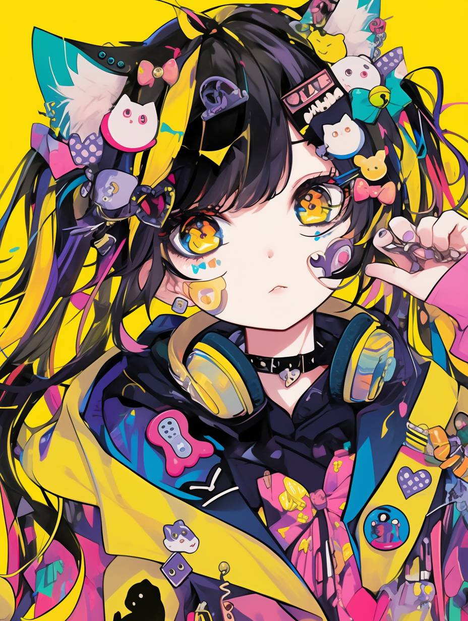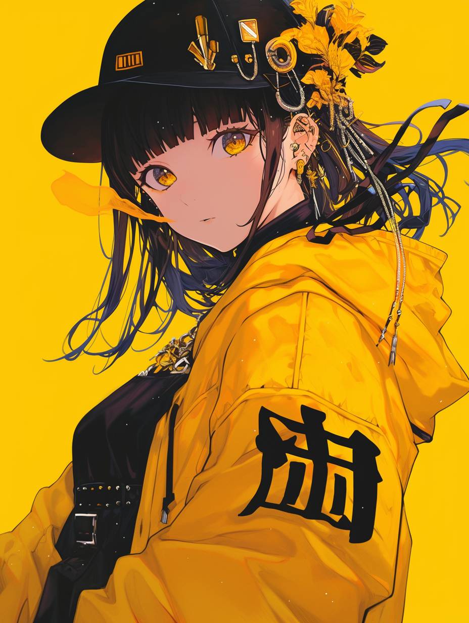 Anime magazine cover, a girl wearing modern clothing, yellow eyes, long black and yellow hair, yellow background, dressed in colorful illustrations in high detail and high-resolution anime style --ar 3:4 --niji 6