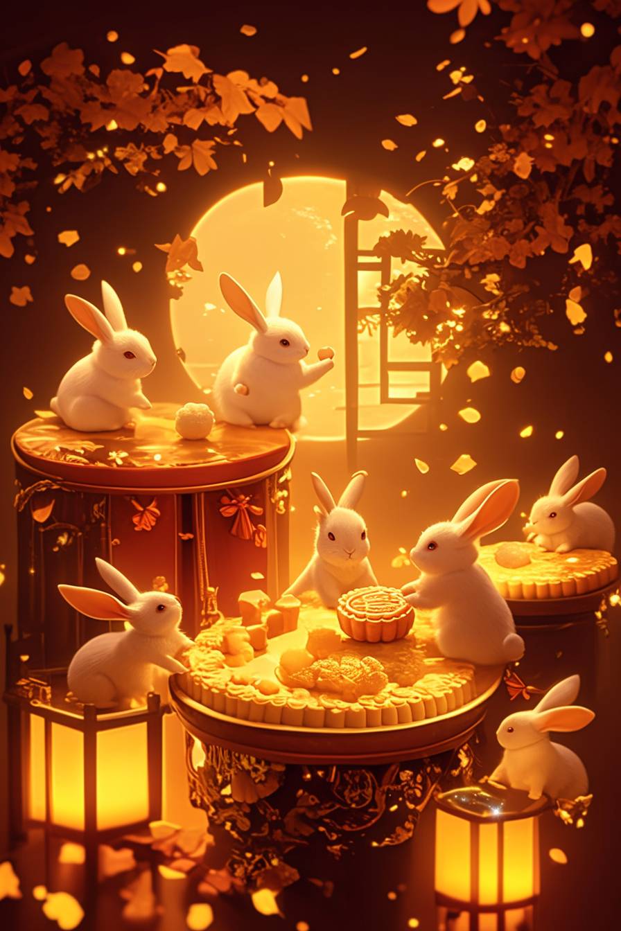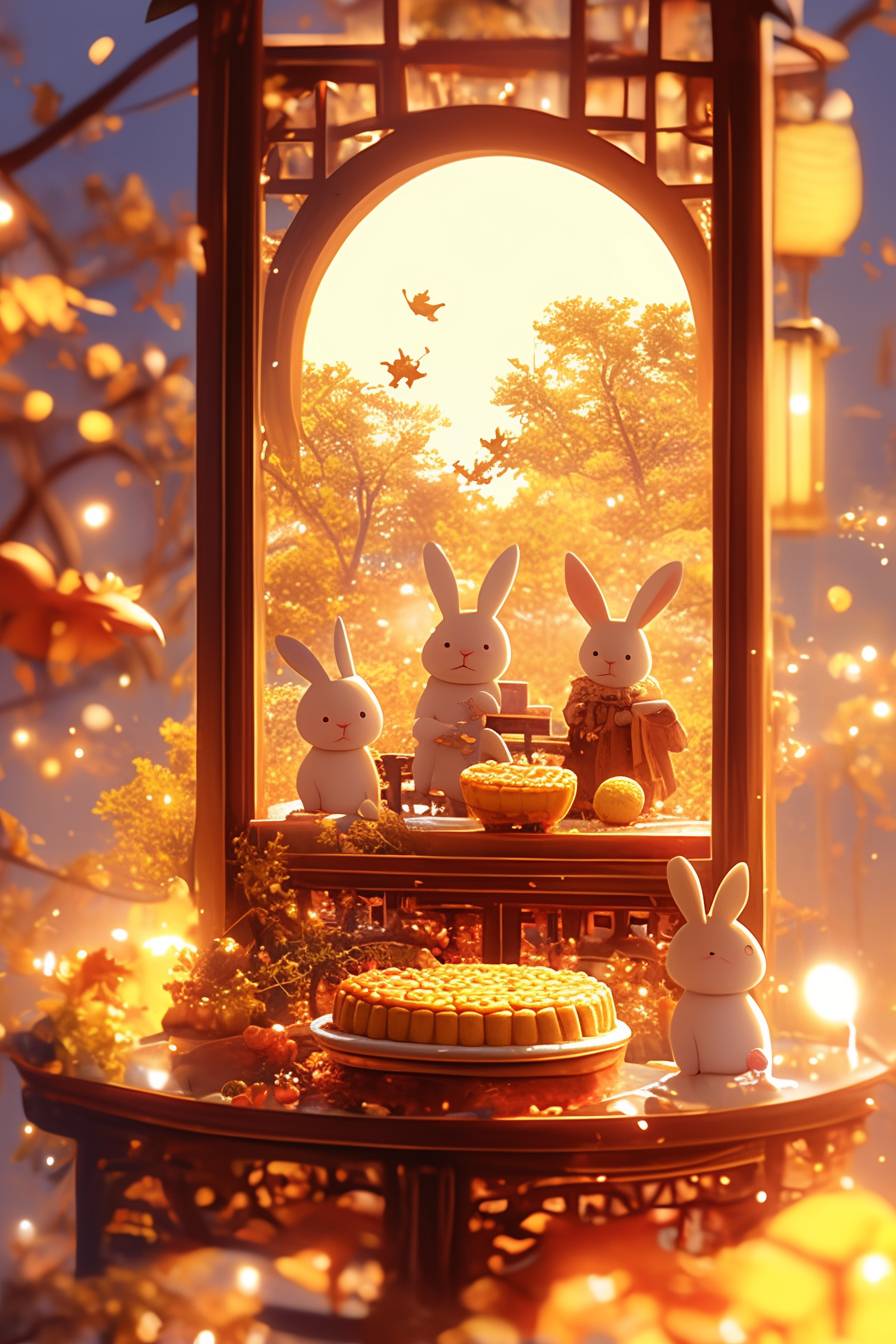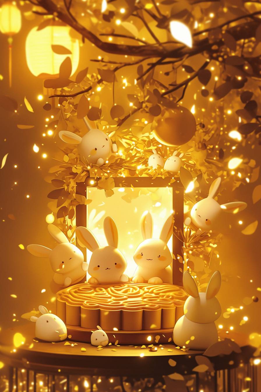 開いた扉の形をした月餅と、内部で夕食を楽しむカートゥーンのウサギたち。シーンは暖かい黄色の光で照らされ、居心地の良い雰囲気を醸し出しています。浅い被写界深度を持つ高品質な写真で、木々から落ちる葉や散らばる金色の konfetti などの細部が際立っています。このポスターは中秋節の祝いの雰囲気を捉えています。