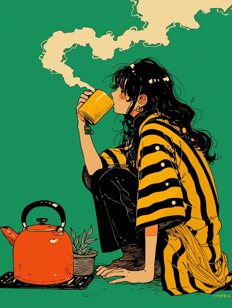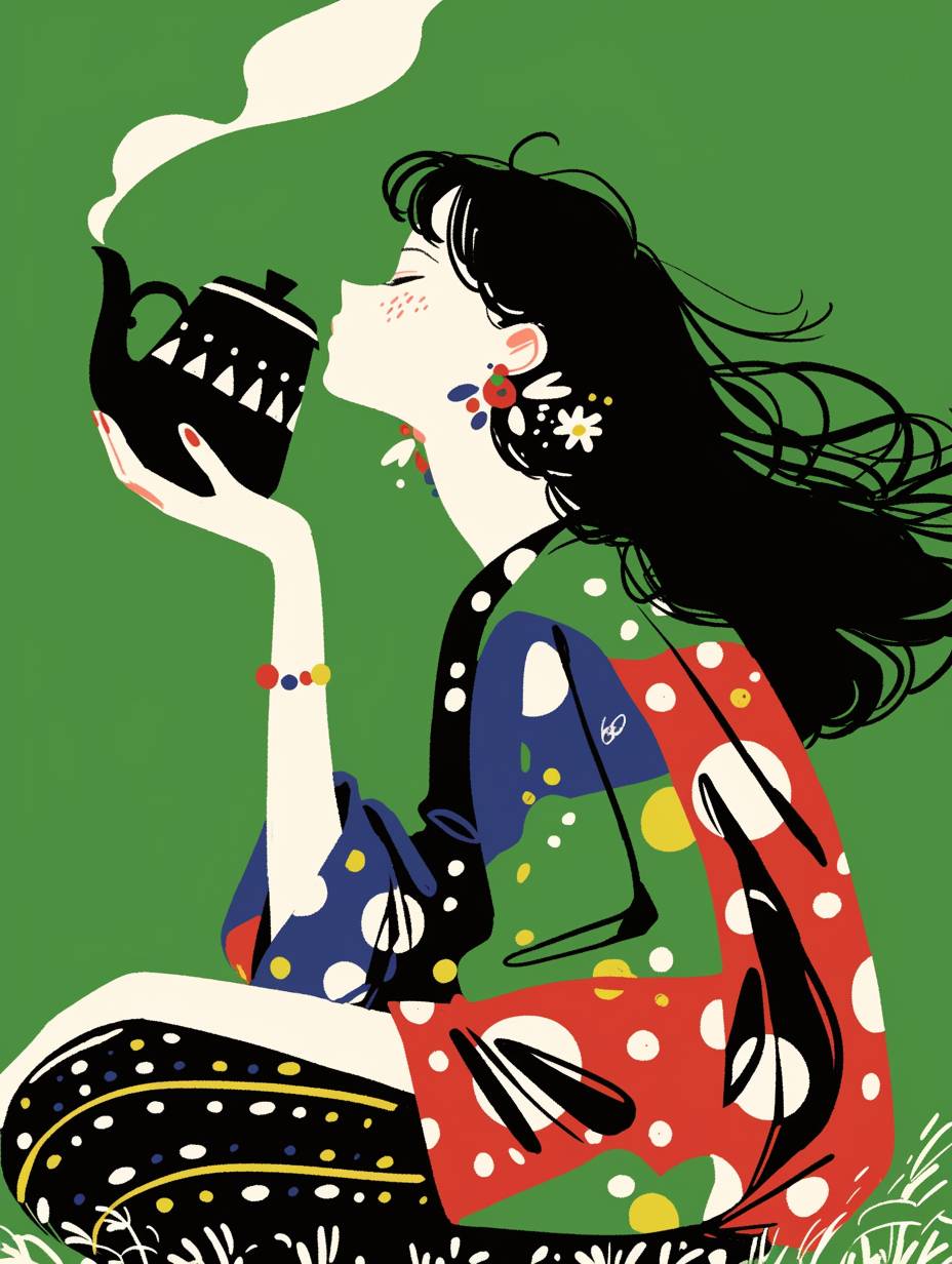 A lovely woman with medium to long hair was sitting on the ground, holding a big kettle and drinking big water, green background, doodle in the style of Keith Haringsharpie illustration, bold lines and solid colors, simple details, minimalist. --ar 3:4 --style raw --stylize 750 --niji 6