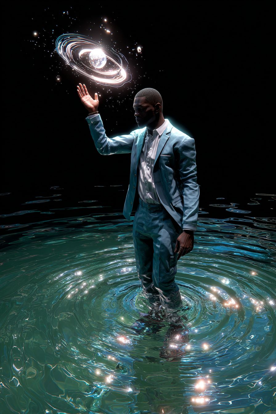スリムなスーツを着た孤独な人物が浅い水の中に立ち、一方の手を上げています。その手のひらの上には、水でできたミニチュアの回転する惑星が浮かんで回転し、光を捉えています。他のすべては虚無です。