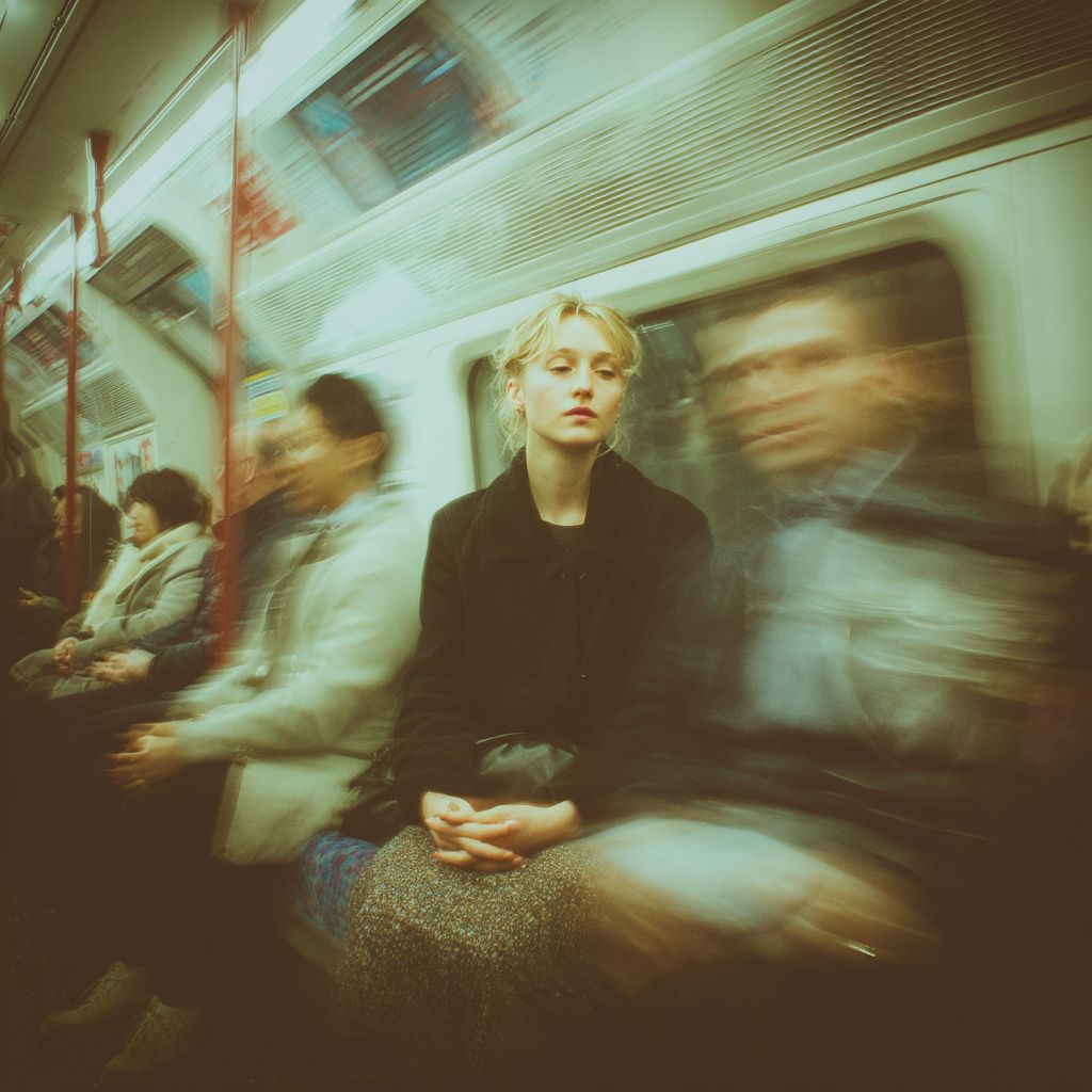 30代の女性がロンドンの地下鉄で静かに座っている周囲の人々は、ぼやけた動きの中にあり、混沌の中の静けさ、リアリズム、ムーディーな環境光を象徴しています。