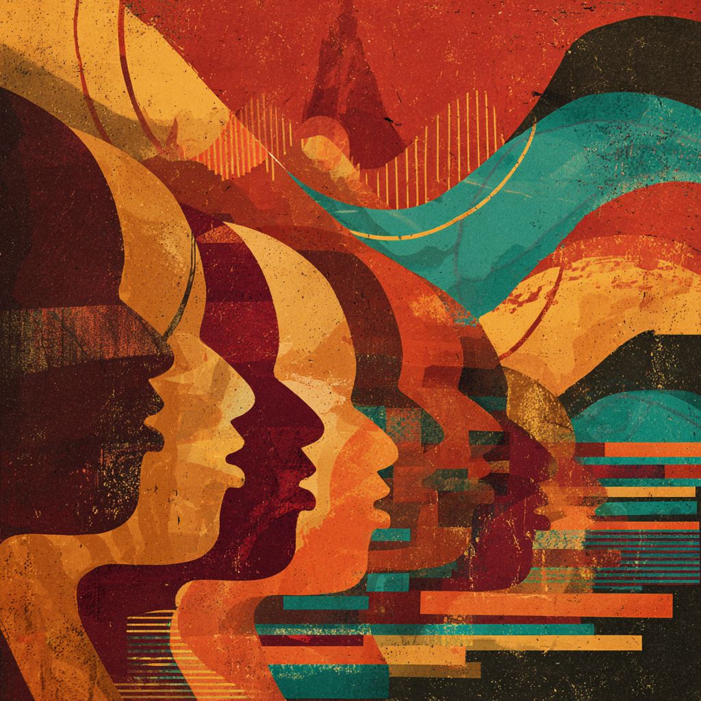 物語を語ることを生きている進化する力として祝う、大胆で表現豊かな楽しい祭りのポスター。アフリカの口承伝統に根ざした。声、音波、動き、パフォーマンスの視覚的モチーフ。リズミカルなパターンから現れる若いストーリーテラー、ダンサー、スピokenワードパフォーマーの重層的なシルエット。温かくエネルギッシュなカラーパレット:深紅、焦げたオレンジ、金色、アースブラウン、鮮やかなティールのアクセント。雰囲気は生き生きとしていて、共同体的で、未来に向かっており、先祖のシンボルと現代デザインを融合させている。