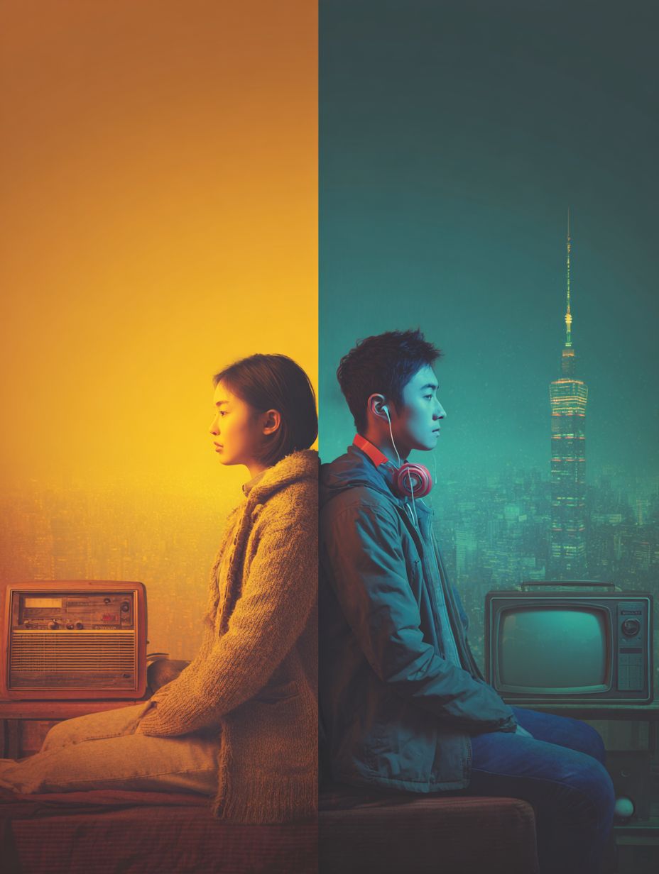 映画のような写真で、時間に隔てられた2人の若い韓国人を分割構図で表現しています。左側には、薄暗いワンルームアパートに座る若い韓国の女性がおり、小さなラジオのそばにいて、温かな黄色の光が漂い、90年代のソウルの雰囲気を醸し出しています。右側には、夜の現代的なラジオブースに座っている若い韓国の男性がいて、青い蛍光灯の光に包まれ、首にヘッドフォンが掛かっています。二人の間には、冬の都市のスカイラインと、両側をつなぐ微弱なラジオ周波数があります。ムードはメランコリックで、ノスタルジックで、ロマンティックな柔らかな映画的照明、浅い被写界深度、暖色と冷色のコントラストです。