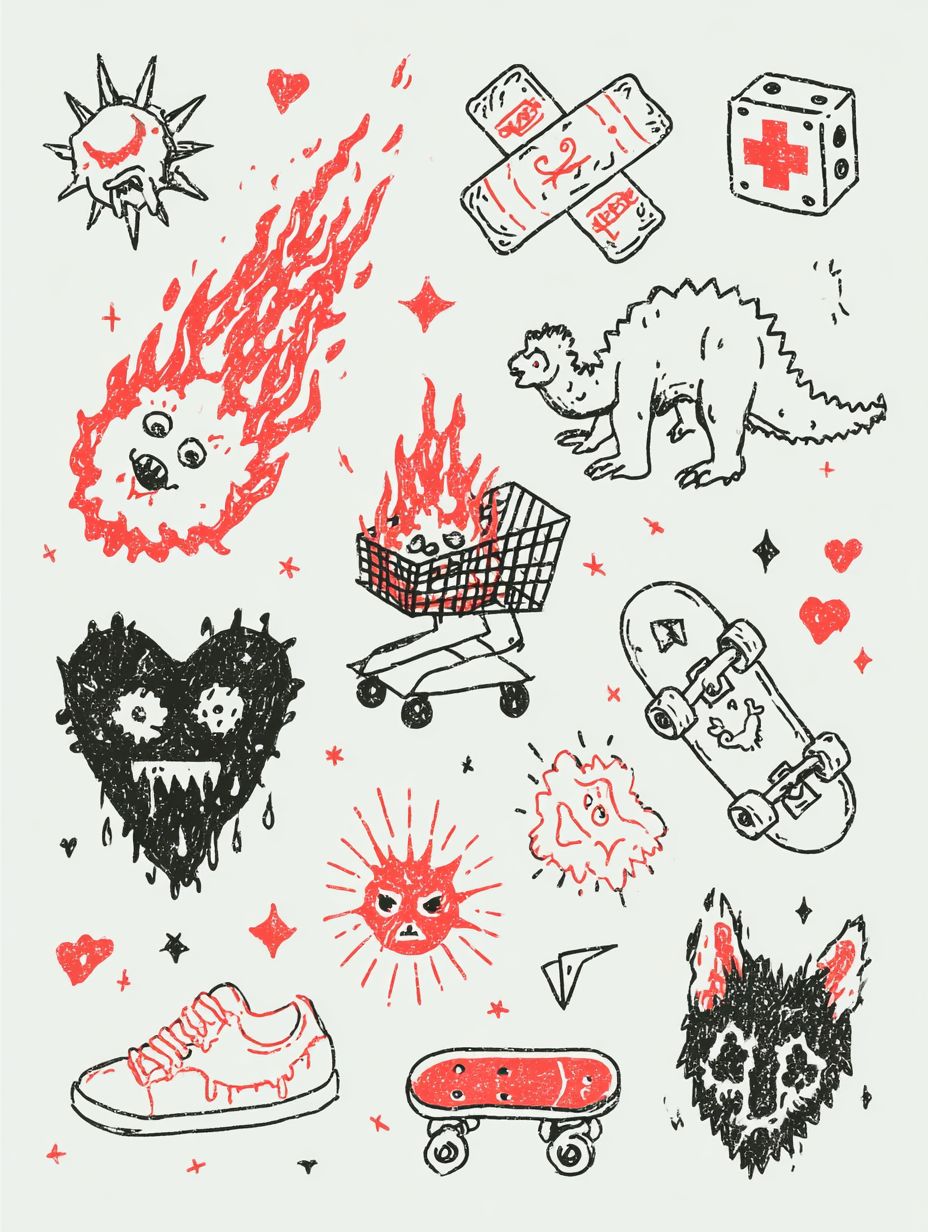 黒と赤のタトゥーフラッシュシートを作成し、グラフィティ風の無知スタイルで表現します。太く、荒々しいラインと遊び心のある不完全さ、ストリートアートのエネルギーを使います。含む要素:顔のある燃える隕石または彗星、竜脚類恐竜、中央にハートのある2つの交差したバンドエイド、翼にハートのある紙飛行機、数字の代わりにハートが表示された6面のサイコロ、空のショッピングカート、壊れた心のデザインのスケートボード、中央にハートのあるスターバーストパターン、笑っている紙と眉をひそめた紙の2枚、絡み合った抽象的な炎のような形、そして大きな目とその上に小さなハートを持つ狐やアライグマに似た動物の頭。構図はエッジィで自発的で、シェーディングや色なしのモノクロに保ちます。