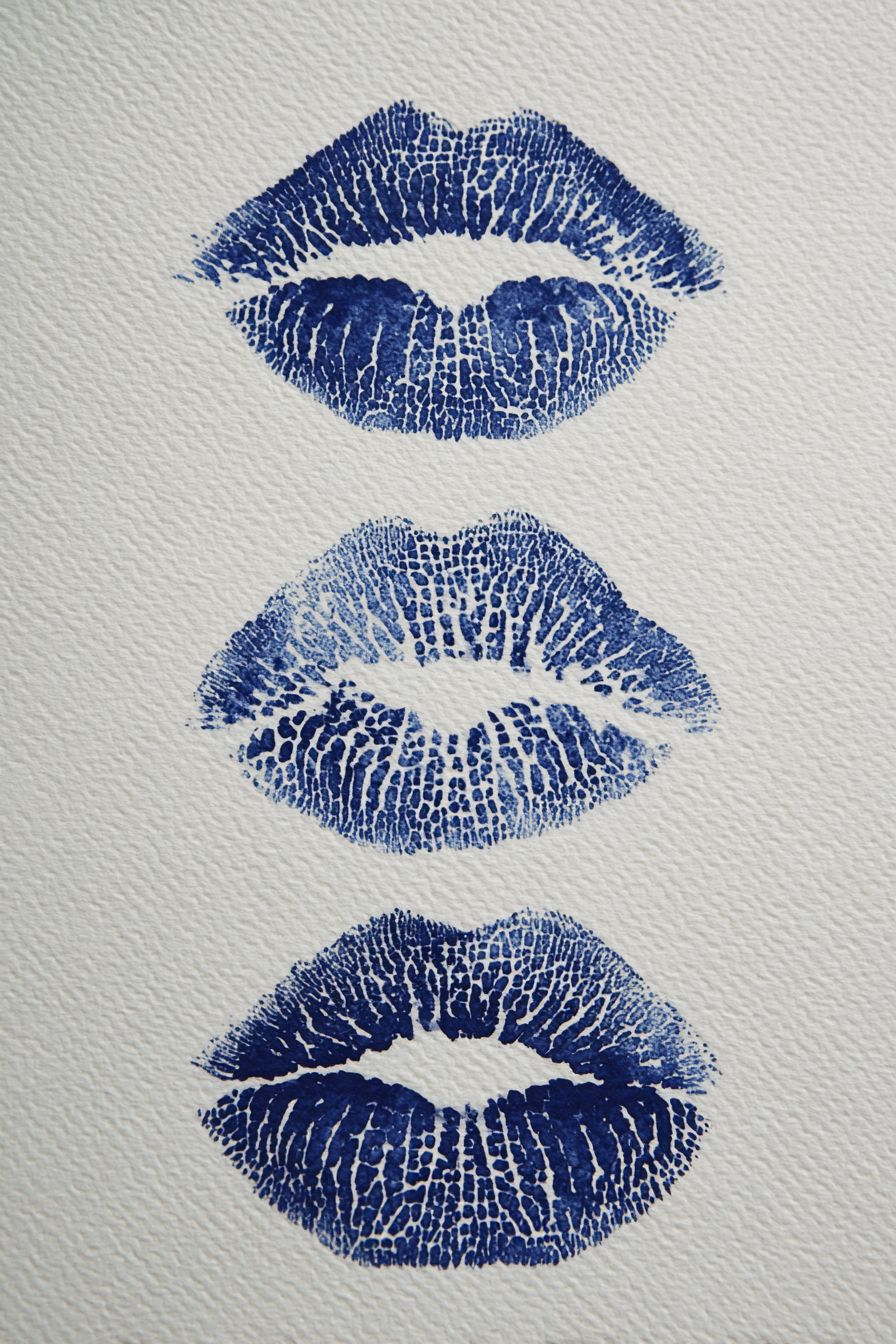 白い紙の上に3つの異なるサイズと技法で描かれた青いインクの唇の印があり、芸術的な構成を作り出しています。唇印はそれぞれのパターンの中心にあり、詳細が明確で繊細な質感を持っています。それぞれのキスマークはユニークな形状とパターンを形成し、作品に視覚的なインパクトを与えています。このデザインは、アーティストのスタイルで、ロマンチックで情熱に満ちた雰囲気を生み出しています。