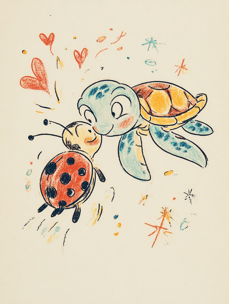 清潔な白い背景に、Tiny ladybugと友好的なsea turtleが暖かくキスしている子供向け本のイラスト。とてもシンプルでアイコニックな形、若干抽象的な感じ。太い遊び心のあるクレヨンのラインと柔らかい水彩の塗り、子供のようなプロポーション、表現豊かな愛情に満ちた幸せな顔。漂うハート、星、優しいコンフェッティの形が愛情を強調。鮮やかだが清潔なカラーパレット。クレヨンと水彩の混合テクスチャー、可視的な手描きのストローク、リアリズムはなし。軽やかで空気感があり、想像力豊かで魅力的、驚きに満ちています。