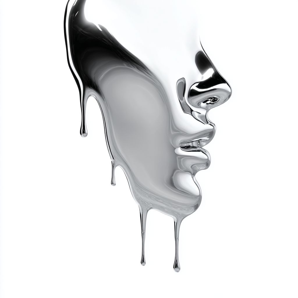 3Dリキッドクロームが白い背景に滴り落ち、女性の顔の形を形成している、ハイパーリアリスティックなスタイル。