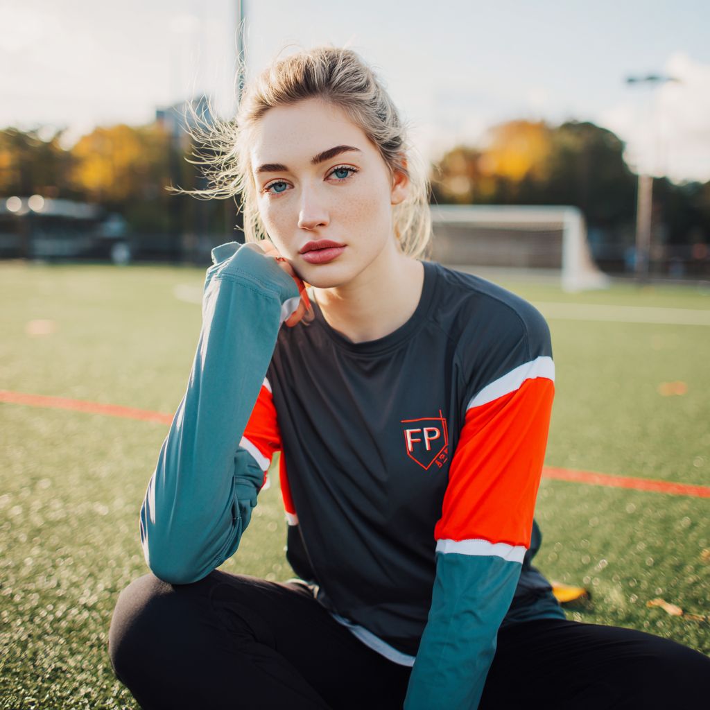 アスレジャーブランドの写真、スポーティなアスレジャーの長袖トップ、サッカー場でトップを着ている女性モデル、ストリートウェア、ファッション先端、カラーコンビネーションのスポーツジャージトップ、刺繍された'FP MOVEMENT'ロゴ、ホッケージャージスタイル