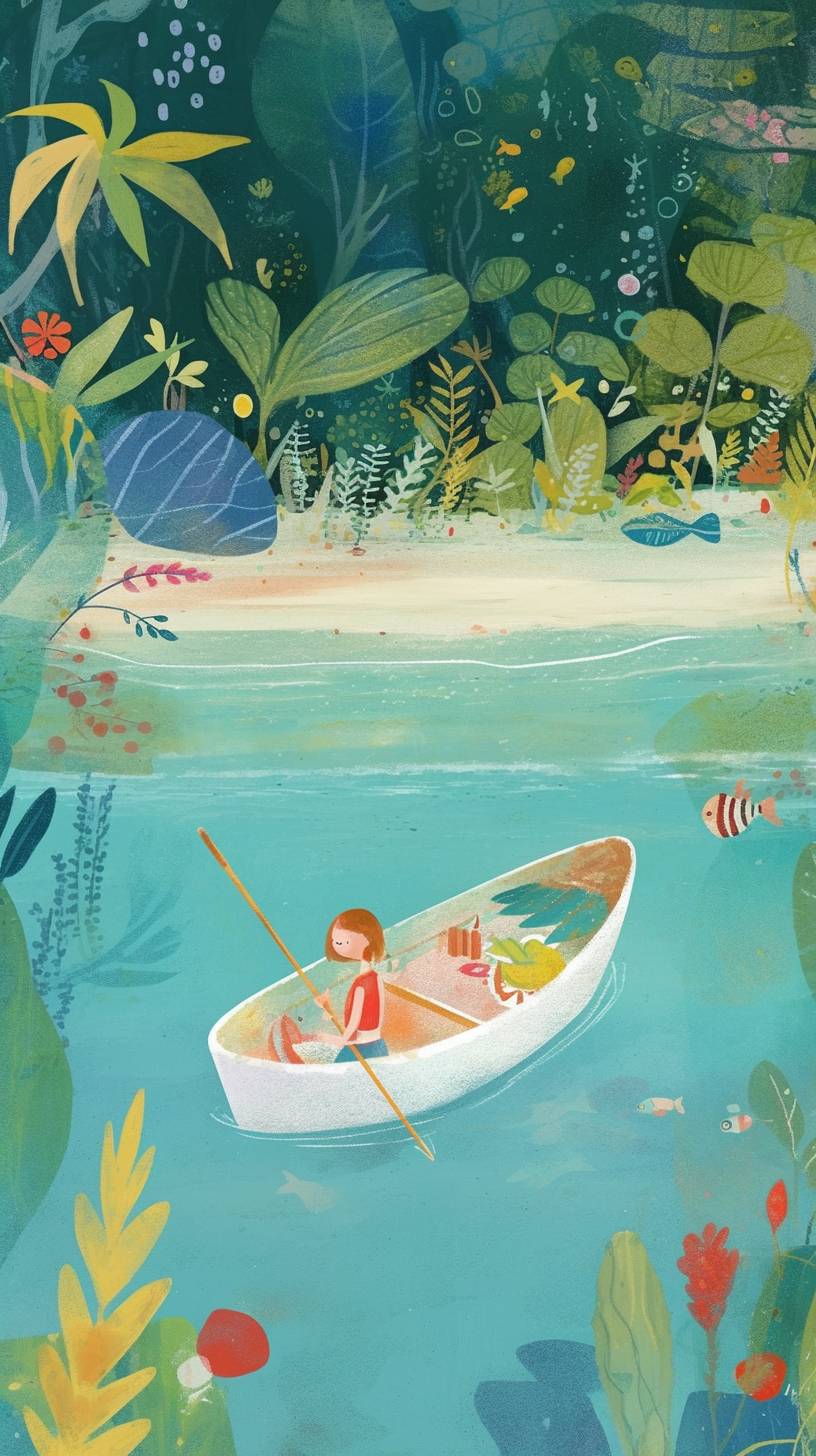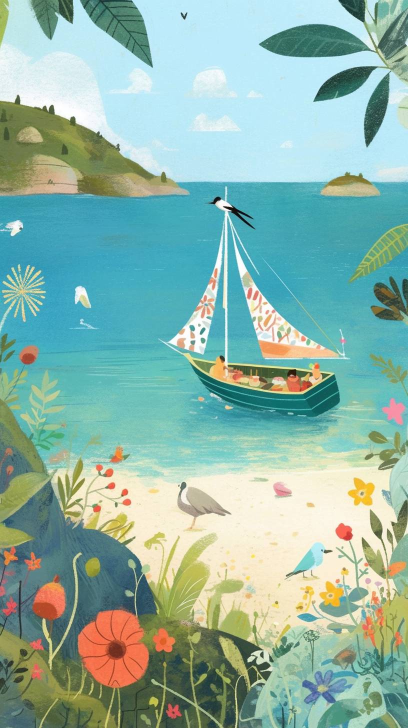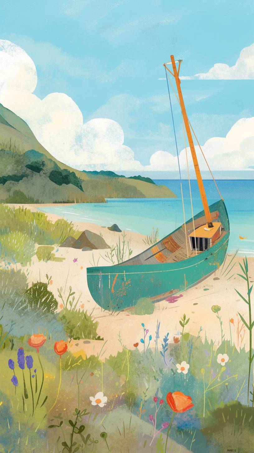 illustration of a deserted beach with a deserted boat in the water --ar 9:16 --niji 6 --sref 3387532994