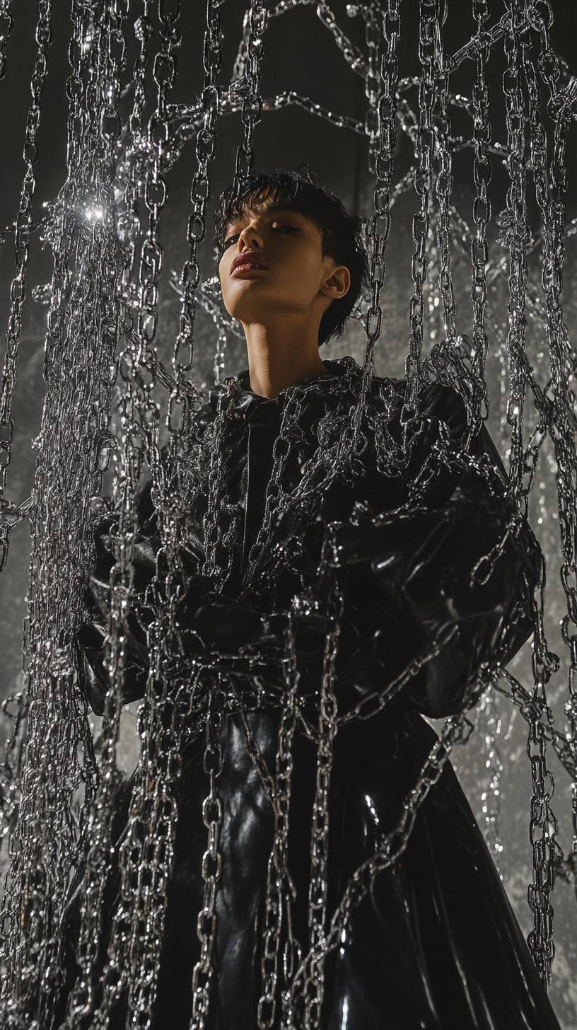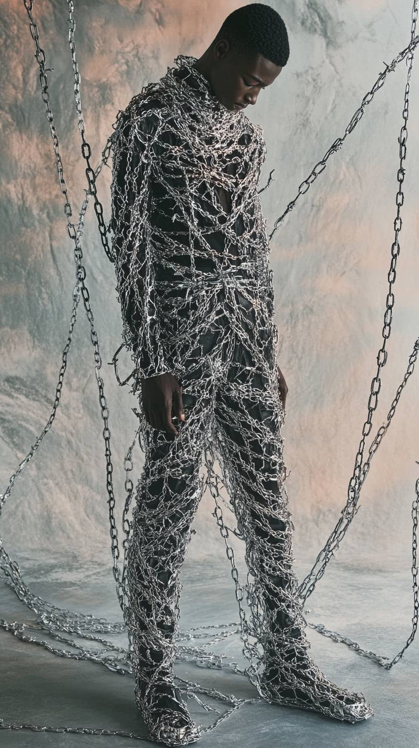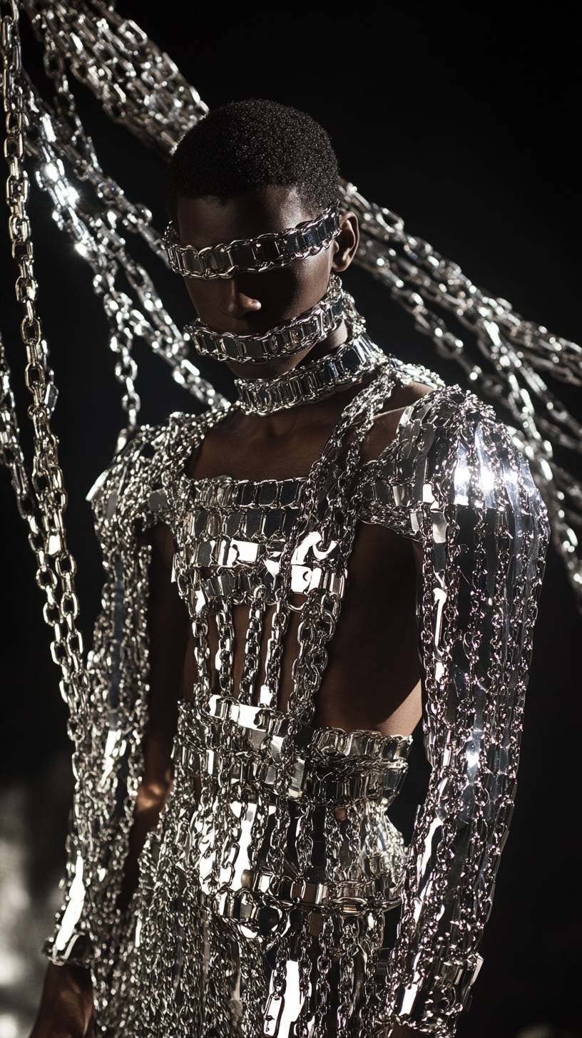 Avant-garde fashion made of woven silver chains. full body. magazine cover. Chains in the background. --ar 9:16 --v 6.1