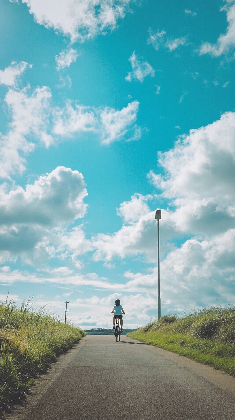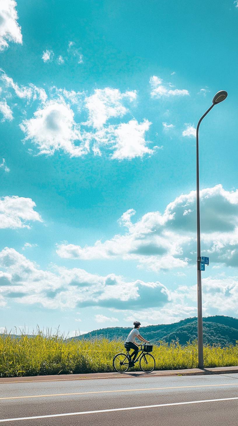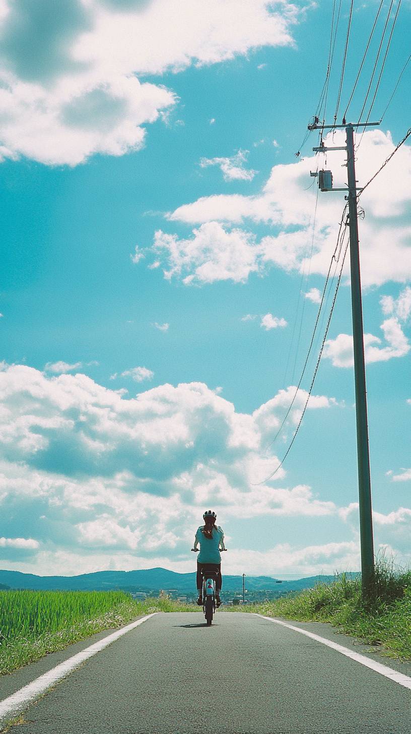 여름에 파란 하늘과 흰 구름 아래 도로에서 전기 자전거를 타고 있는 사람, 그 옆에 녹색 초지가 있고 가로등이 옆에 있는 모습. 이 이미지는 카와우치 링코 스타일이다. 이미지는 후지 필름 전문 스타일의 필름 사진 같은 느낌이 있으며, 저채도 색조, 흐릿한 렌즈, 꿈 같은 스타일, 부드러운 초점, 광각, 필름 그레인, 큰 빈 공간이 있는 미니멀한 구도로 구성되어 있다. 그 사람은 착용하고 있다.
