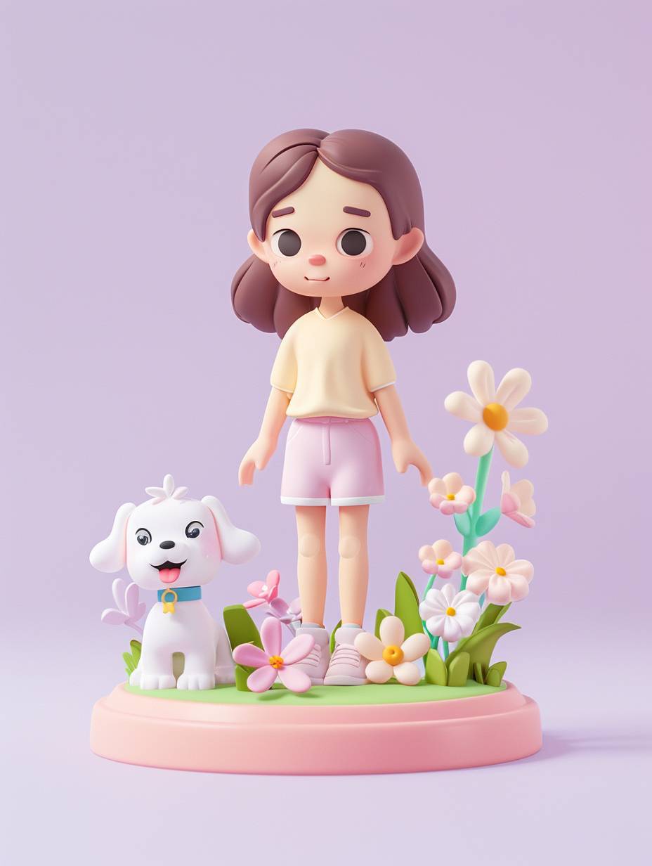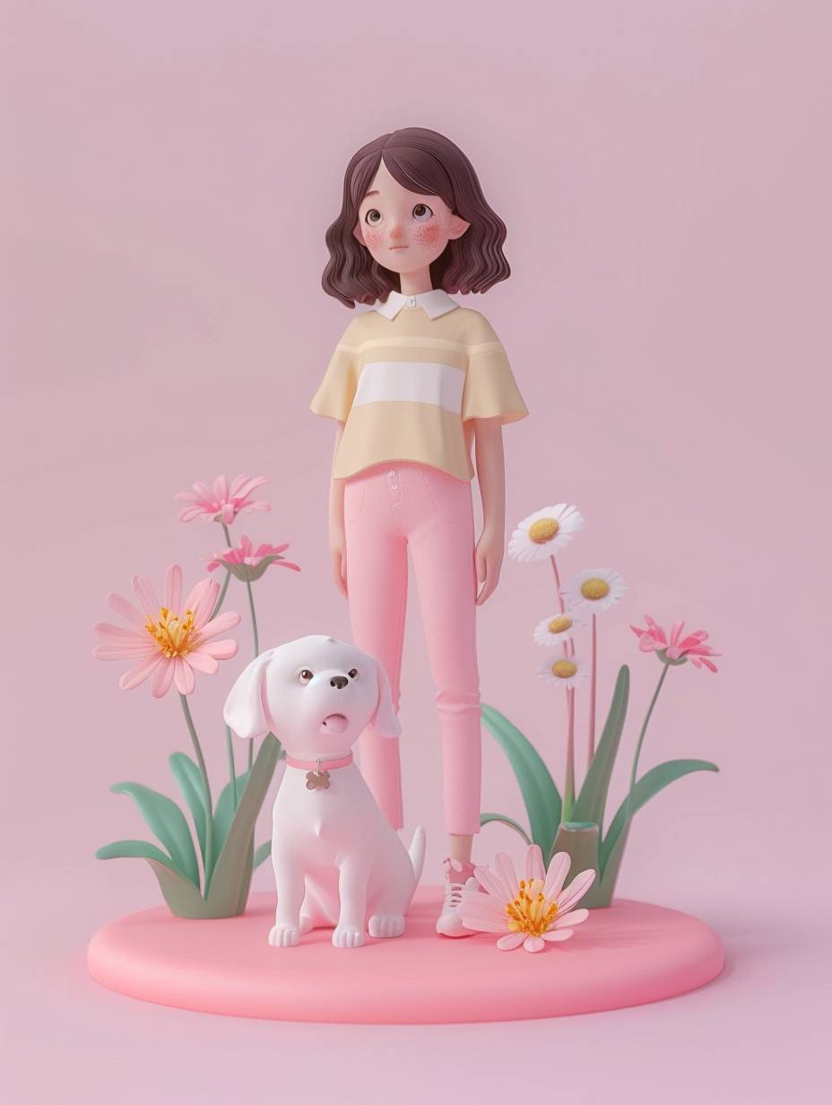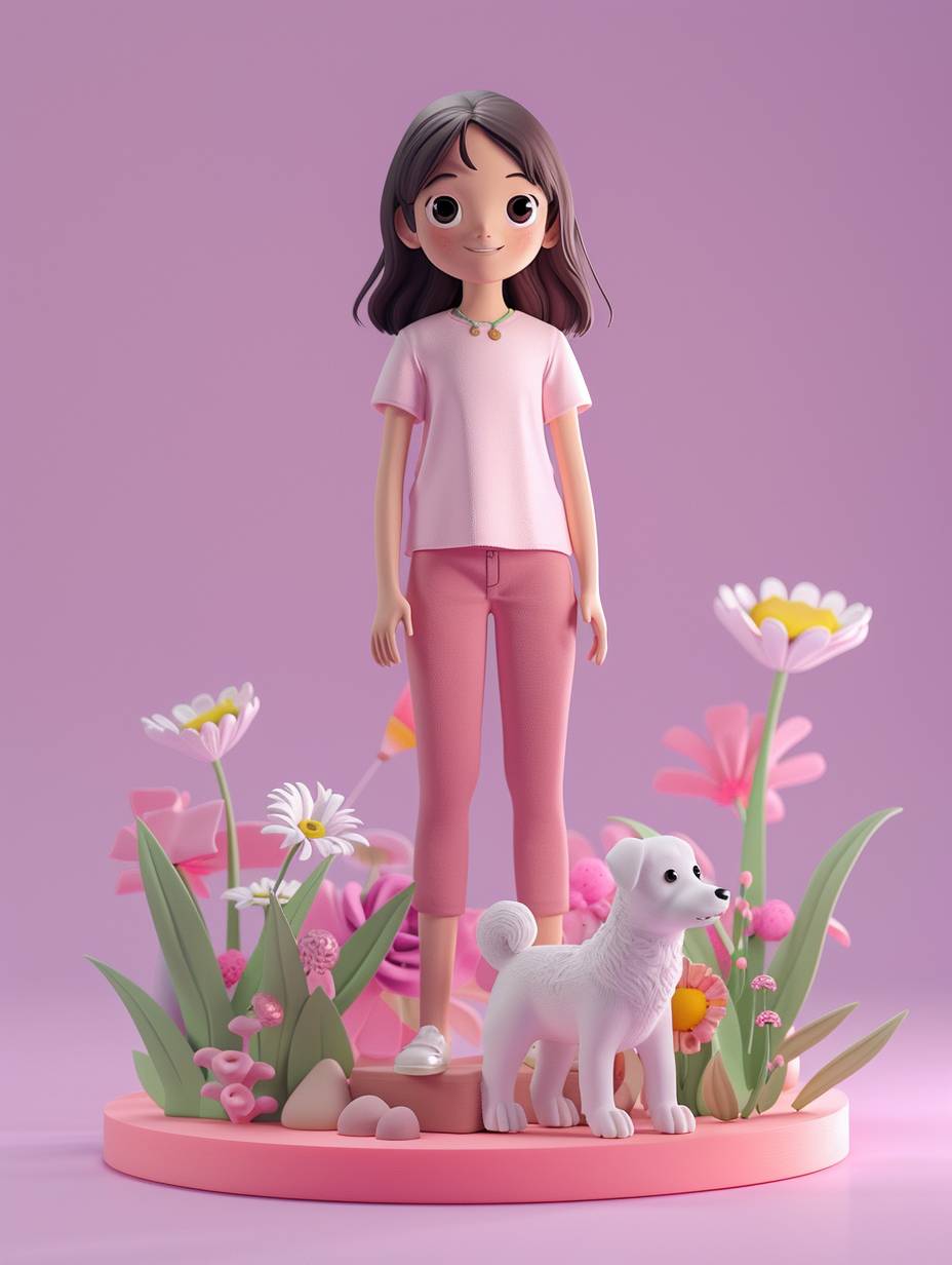 3D rendering in C4D. A cute cartoon style girl stands on a pink base with flowers and a white dog, wearing short sleeves and pink pants against a simple background. 8k smooth rendering with low detail and no fine details. Clean light purple solid color background. Cartoon style rendering with the highest quality and resolution and no shadows. --ar 3:4 --v 6.0