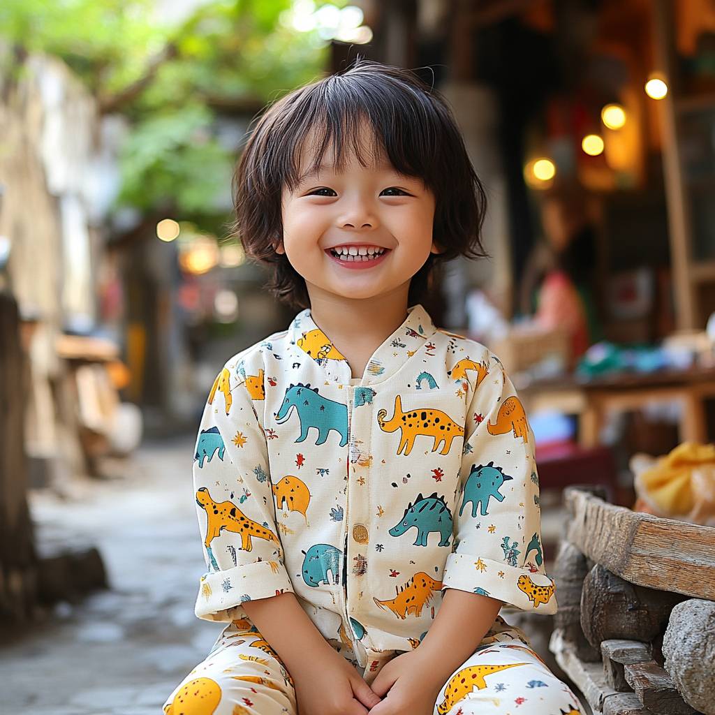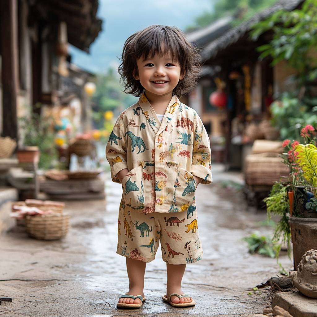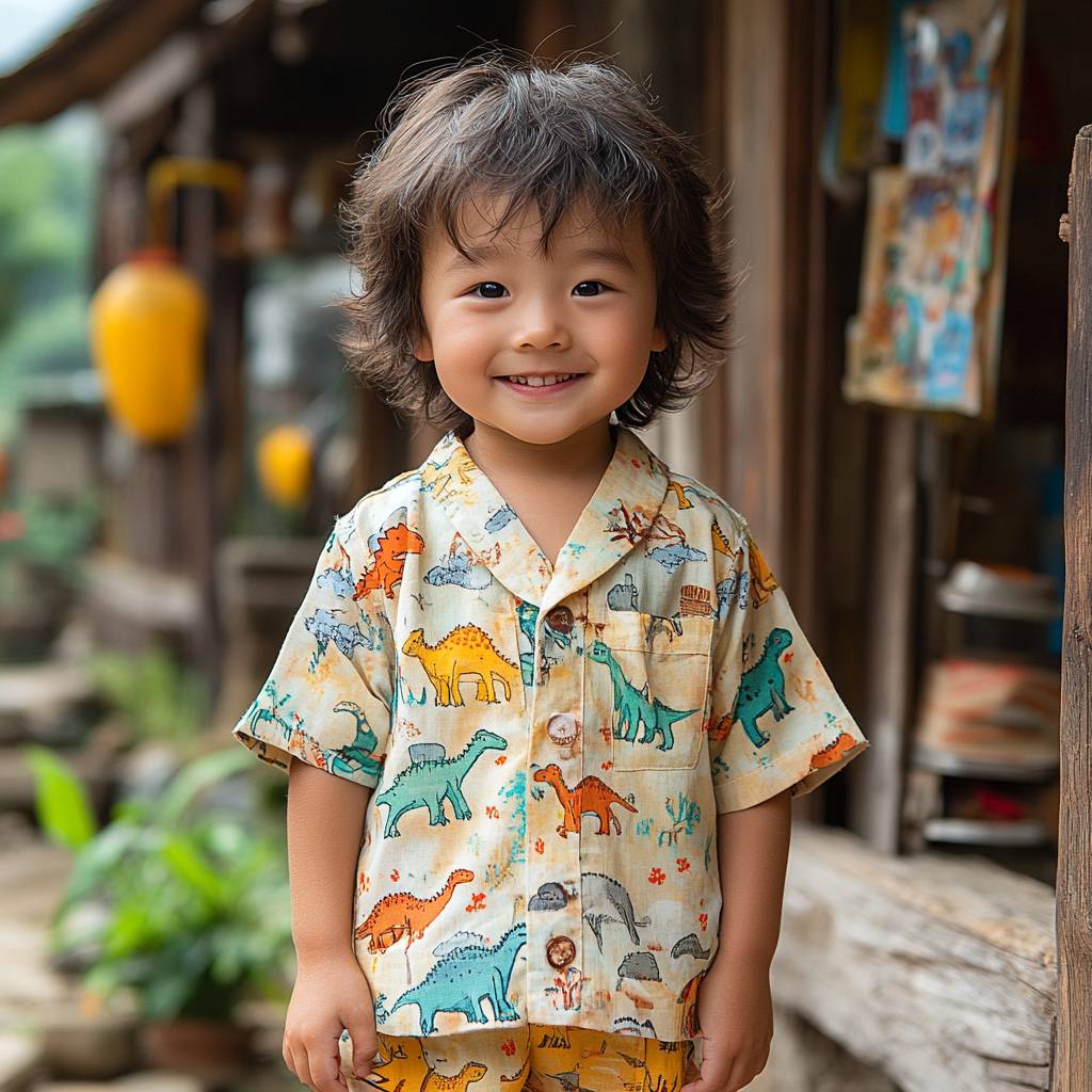 A cute little boy from Guangxi, with thicks hair, smiles sweetly at the camera, wearing a shorts suit with dinosaur elements, made of cotton, and cute sandals on his feet. --stylize 750 --v 6.1