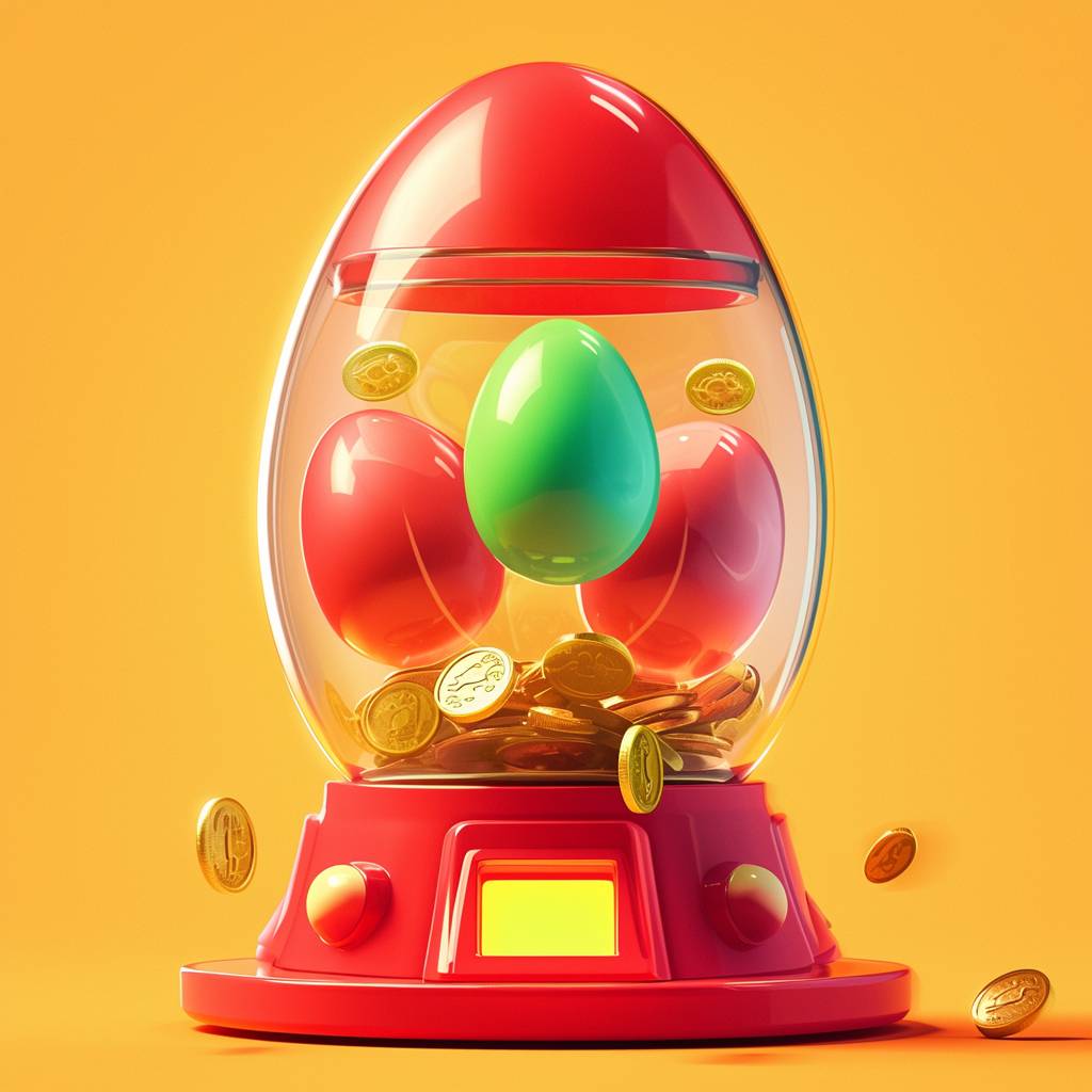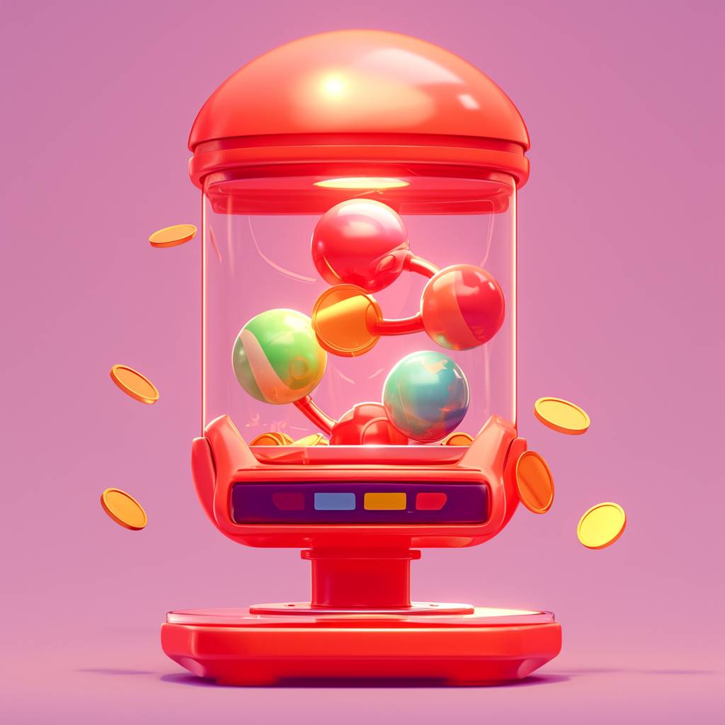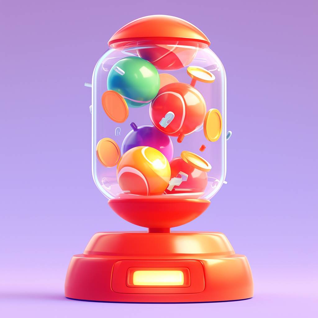 빨간색 Q버전 달걀 비틀기 기계로, 세 개 또는 네 개의 컬러 볼이 공간의 절반을 차지하고 있으며 바닥에는 직사각형의 조명 버튼이 있습니다. 배경 색상은 연보라색 그라데이션이며, 장식으로 동전이 있으며 숫자나 텍스트는 없습니다. 간단한 배경, 3D, C4D, 블렌드, 고품질, 고해상도, 32k.
