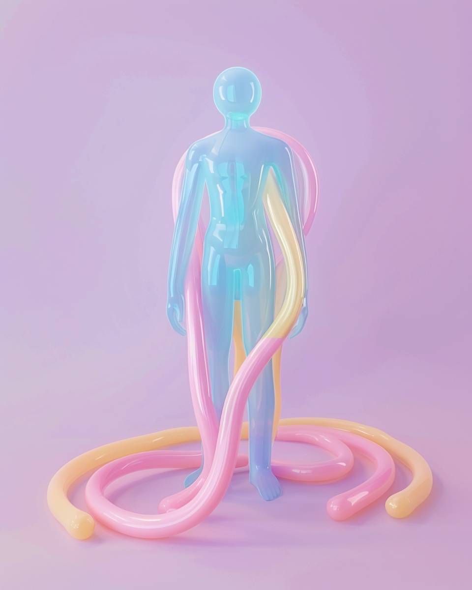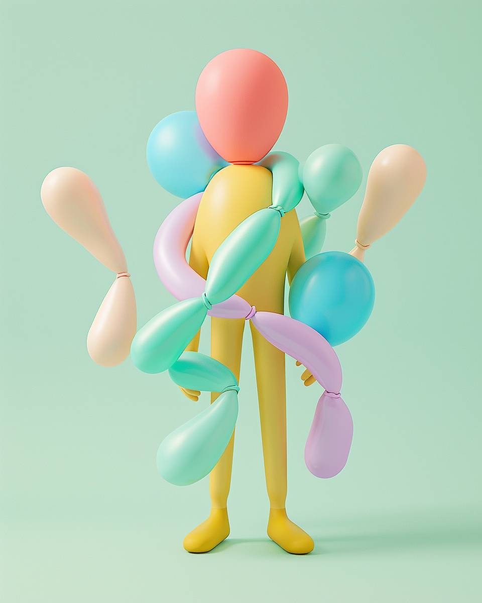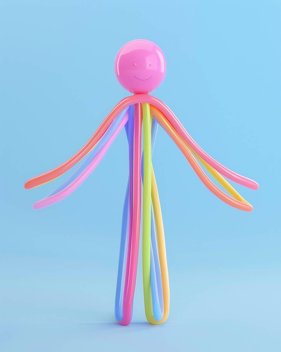 긴 풍선으로 만든 인간 캐릭터, 간단하고 평면적이며 입체적인 긴 풍선, 파스텔의 생생한 색상.