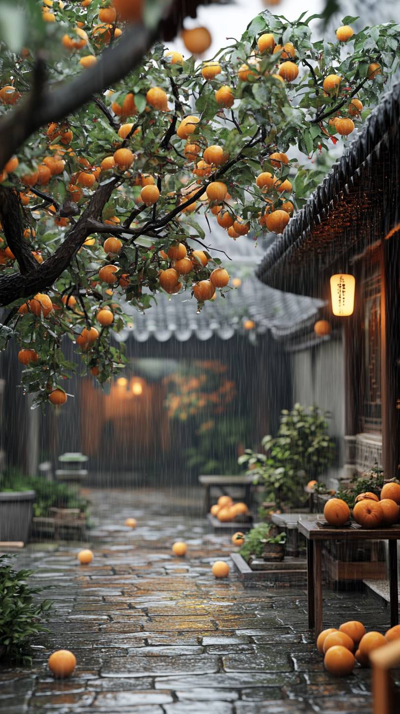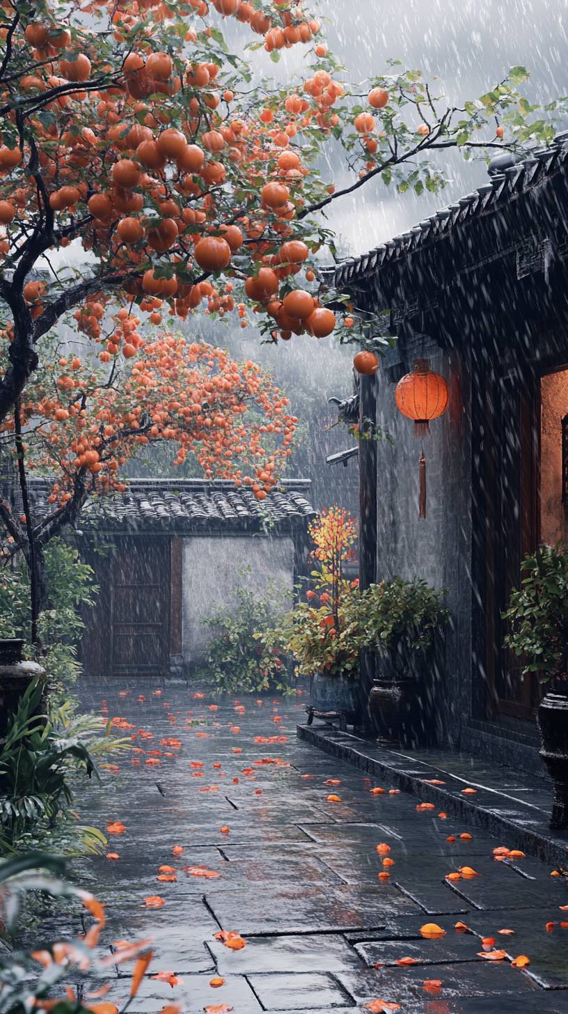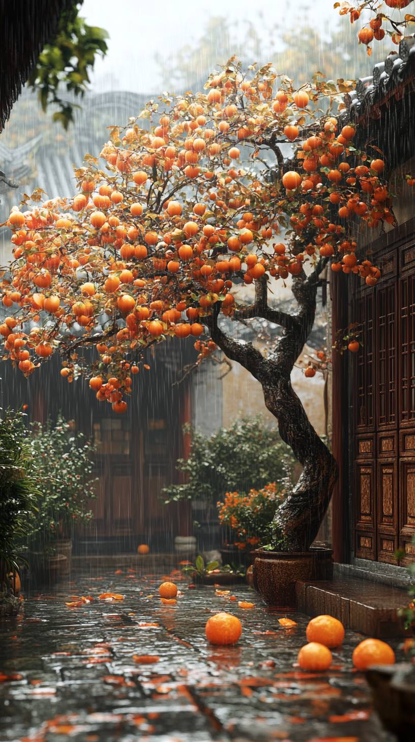 In autumn, a traditional Chinese courtyard is drenched in heavy rain. Within the courtyard stands a large persimmon tree, laden with many persimmons. hyper-realistic and high-resolution. --ar 9:16 --style raw --stylize 250 --v 6.1