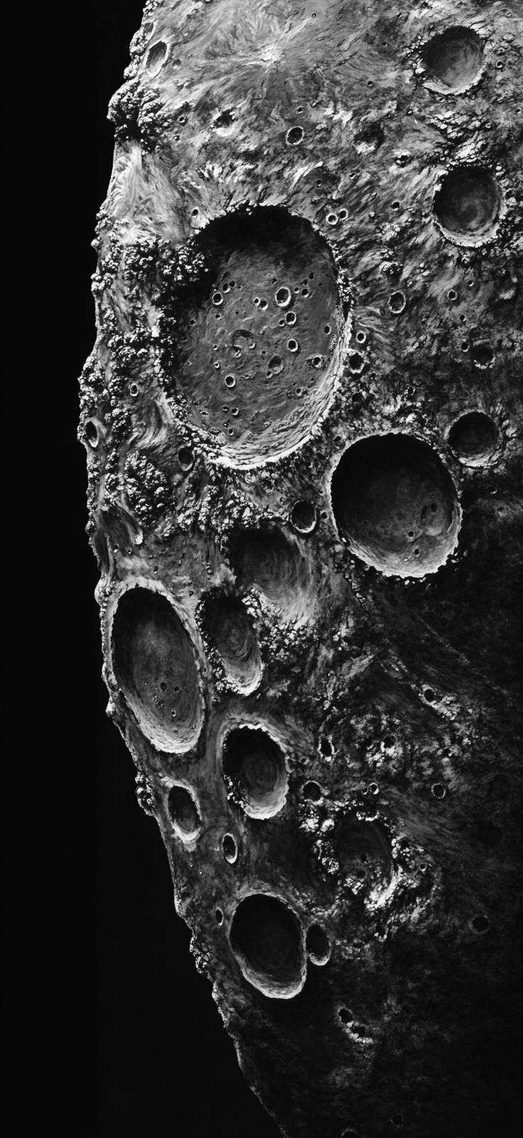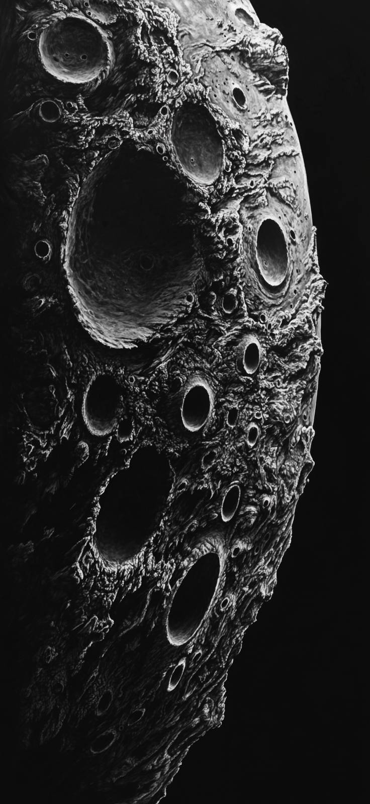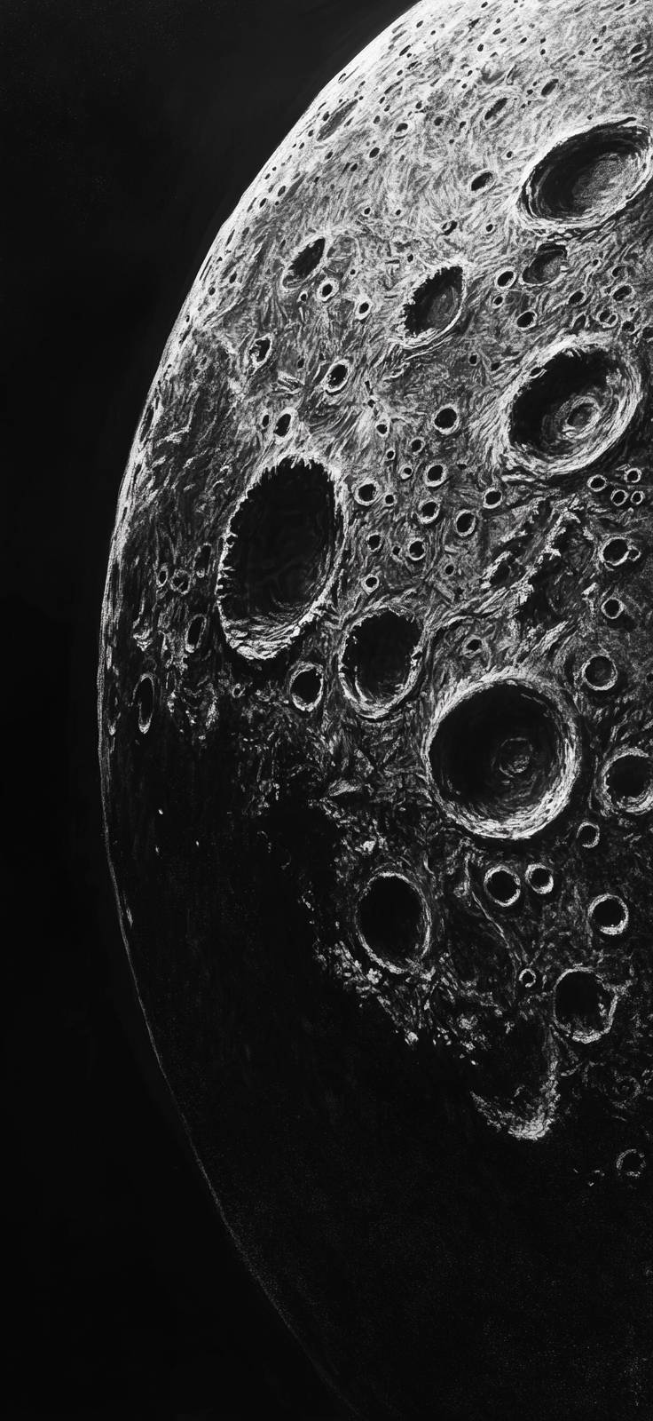 A detailed black-and-white illustration of the moon's surface, showcasing craters in high detail against an all-black background. The focus is on capturing intricate details such as rugged textures and shadows cast by the craters. It evokes a sense of awe for our solar system and its stunning beauty. --ar 59:128 --v 6.1