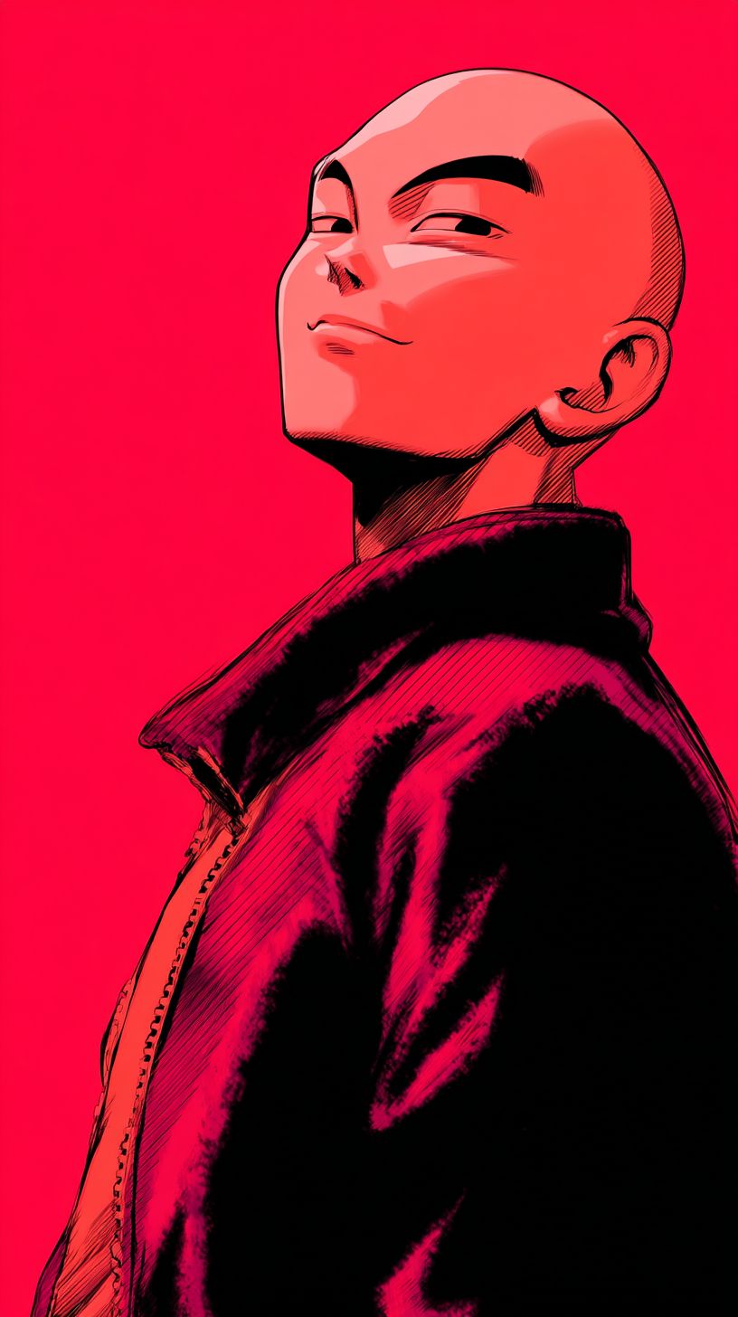 드래곤볼의 크리링, 상반신 초상화, 그의 원래 복장에서 영감을 받은 스타일리시한 현대 스트리트웨어를 입고, 자신감 있고 차분한 자세로 약간 옆을 바라보고 있음, 미니멀리스트의 순수한 빨간 배경, 활기찬 팝 아트 스타일, 깔끔한 애니메이션 선화, 영화 같은 조명, 세심하게 그려진 얼굴과 머리, 밝고 생생한 색상, 포스터 구성.