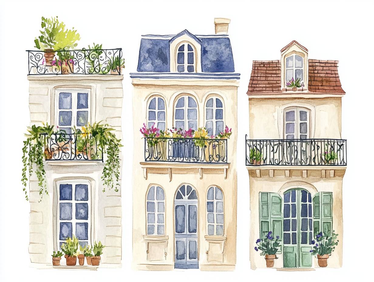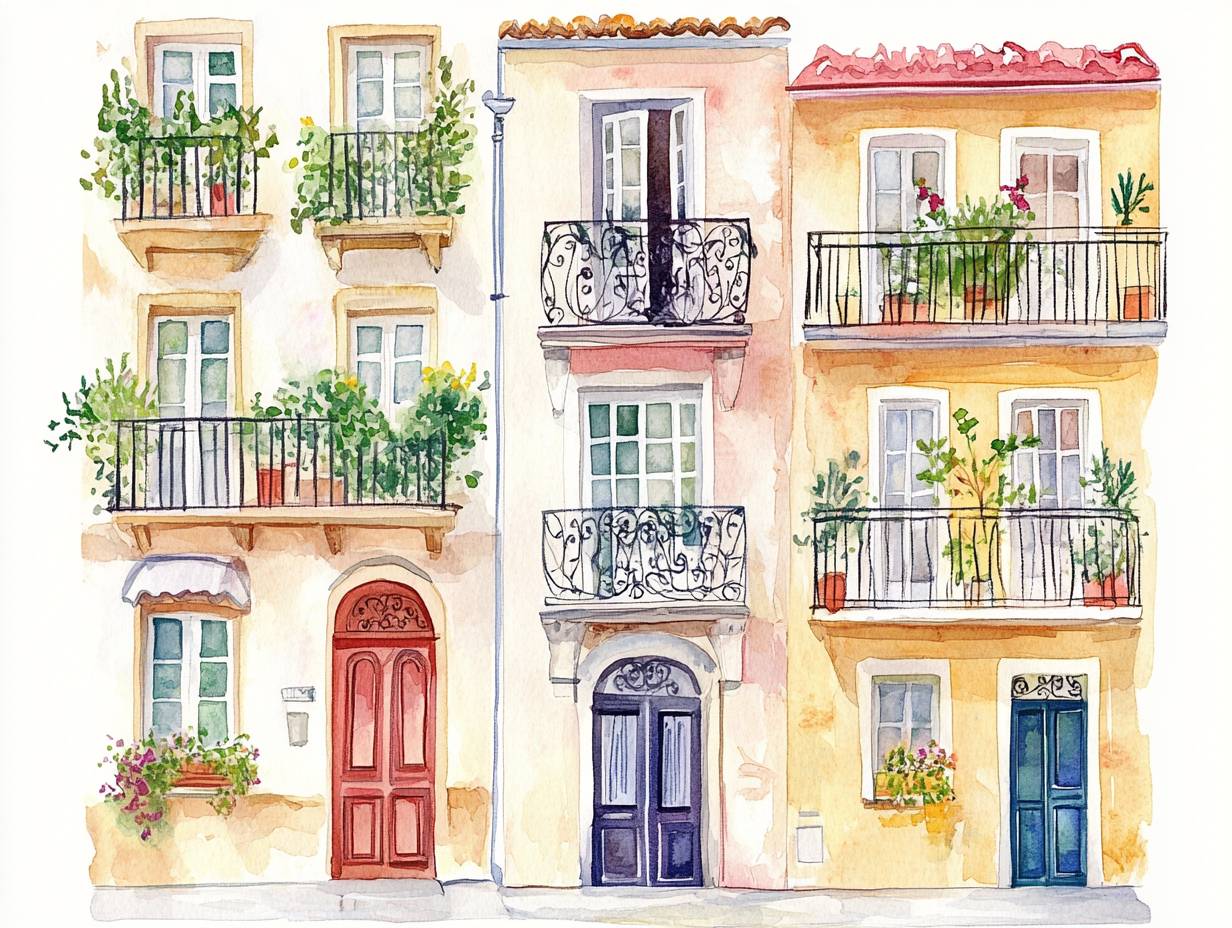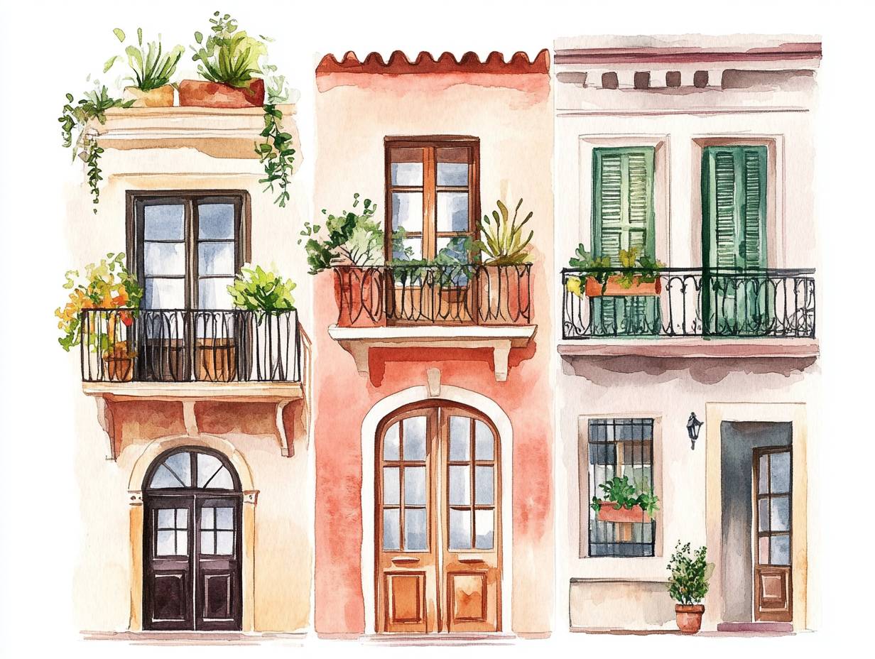 A simple watercolor illustration of three european homes in a row each with a beautiful front door, different decorative balconies and window styles. Put colorful plants on the balconies and in the windows. --ar 4:3 --v 6.1