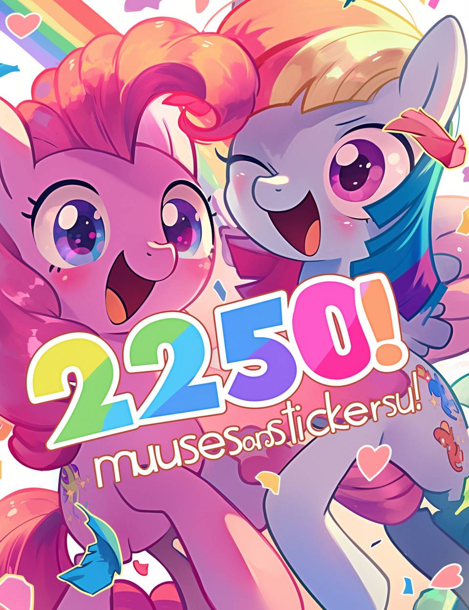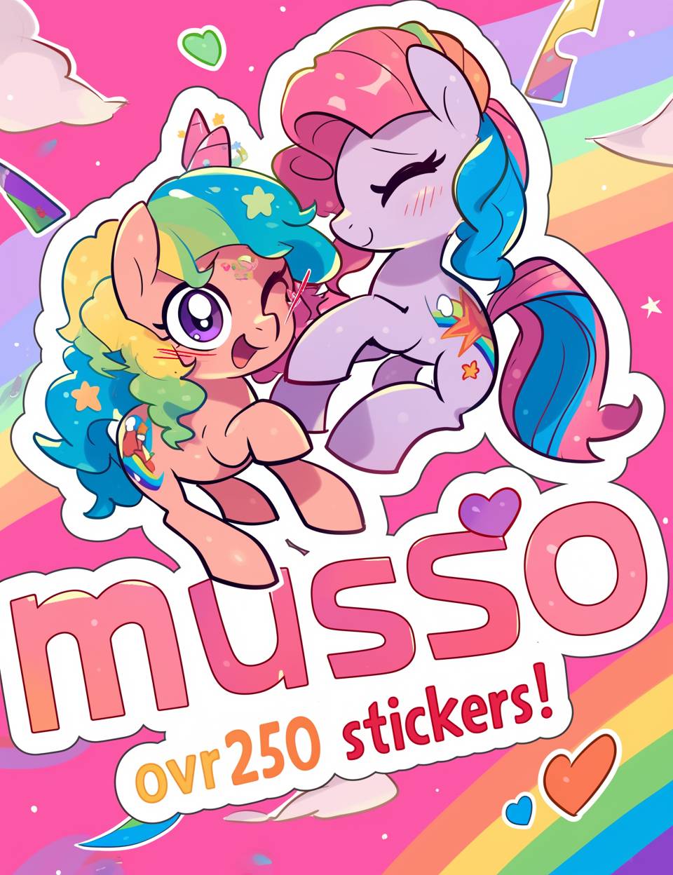 The cover of the " musesai.io" has two pony on it, with hearts and stars in background, featuring rainbow wireframe hologramic text that says " over250 stickers!" . The poster is pink yellow blue purple red orange white and green. In style of cartoon network or adventure time art , vibrant, fun. A sticker set for kids, with an illustration of my little pony flying next to another pony. by Marc Ellerby. 3d render. 4 k --ar 24:31 --niji 6
