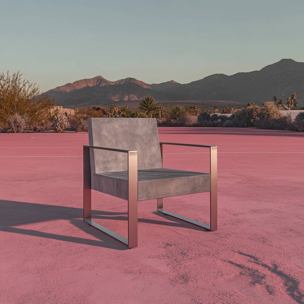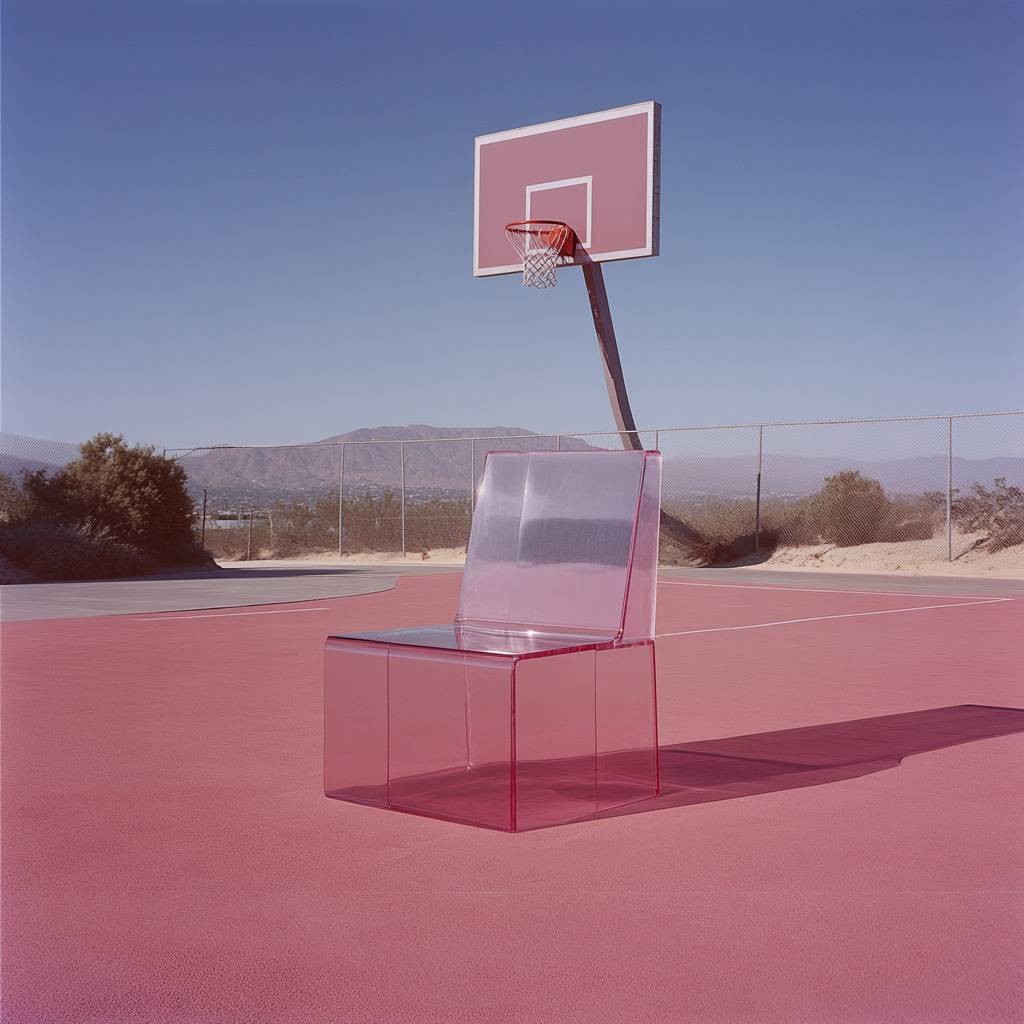 A modern chair made of a gray metal frame and glass tiles, The glass tiles are engraved with a geometric grid pattern. The chair has a square shape, with an equal proportion of metal and glass. The contrast between the metal frame and glass materials is striking in both the backrest and seat. set on a pink basketball court in the middle of a desert in Los Angeles, California. The lighting is cinematic, in the night, in the style of Roger Deakins. The photo is shot from slightly below eye level, with defined grain and a classic film aesthetic. The lighting is frontal, creating strong shadows and contrast. The scene has the look of an 80s magazine, captured with an analog camera, featuring an expansive wide shot.stylize 250 --stylize 50 --v 6.1