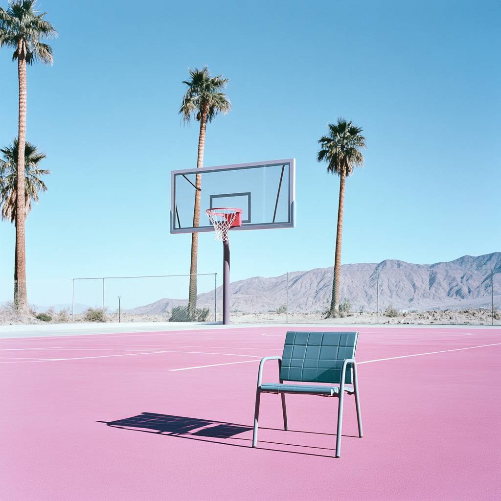 회색 금속 프레임과 유리 타일로 만들어진 현대적인 의자. 유리 타일에는 기하학적 격자 패턴이 새겨져 있습니다. 의자는 정사각형 모양으로 금속과 유리의 비율이 동일합니다. 금속 프레임과 유리 재료 간의 대조는 등받이와 좌석 모두에서 눈에 띄게 나타납니다. 의자는 캘리포니아 로스앤젤레스 사막의 분홍색 농구 코트에 놓여 있습니다. 조명은 영화적이며, 밤에 로저 디킨스 스타일로 촬영되었습니다. 사진은 약간 눈높이 아래에서 촬영되었으며, 정의된 곡물과 클래식 필름 미학을 가지고 있습니다. 조명은 정면에서 비추어 강한 그림자와 대비를 만들어냅니다. 이 장면은 80년대 잡지의 모습으로, 아날로그 카메라로 촬영된 광범위한 와이드 샷을 특징으로 합니다.