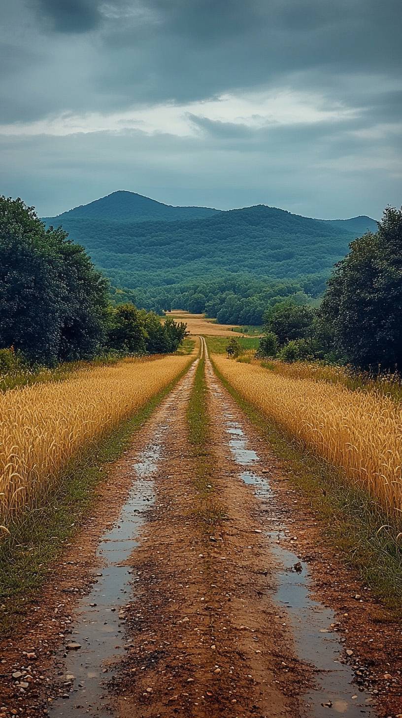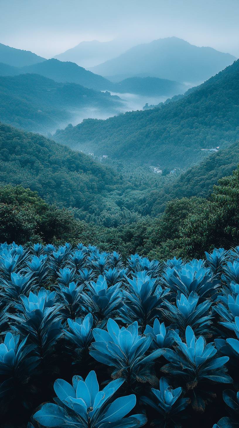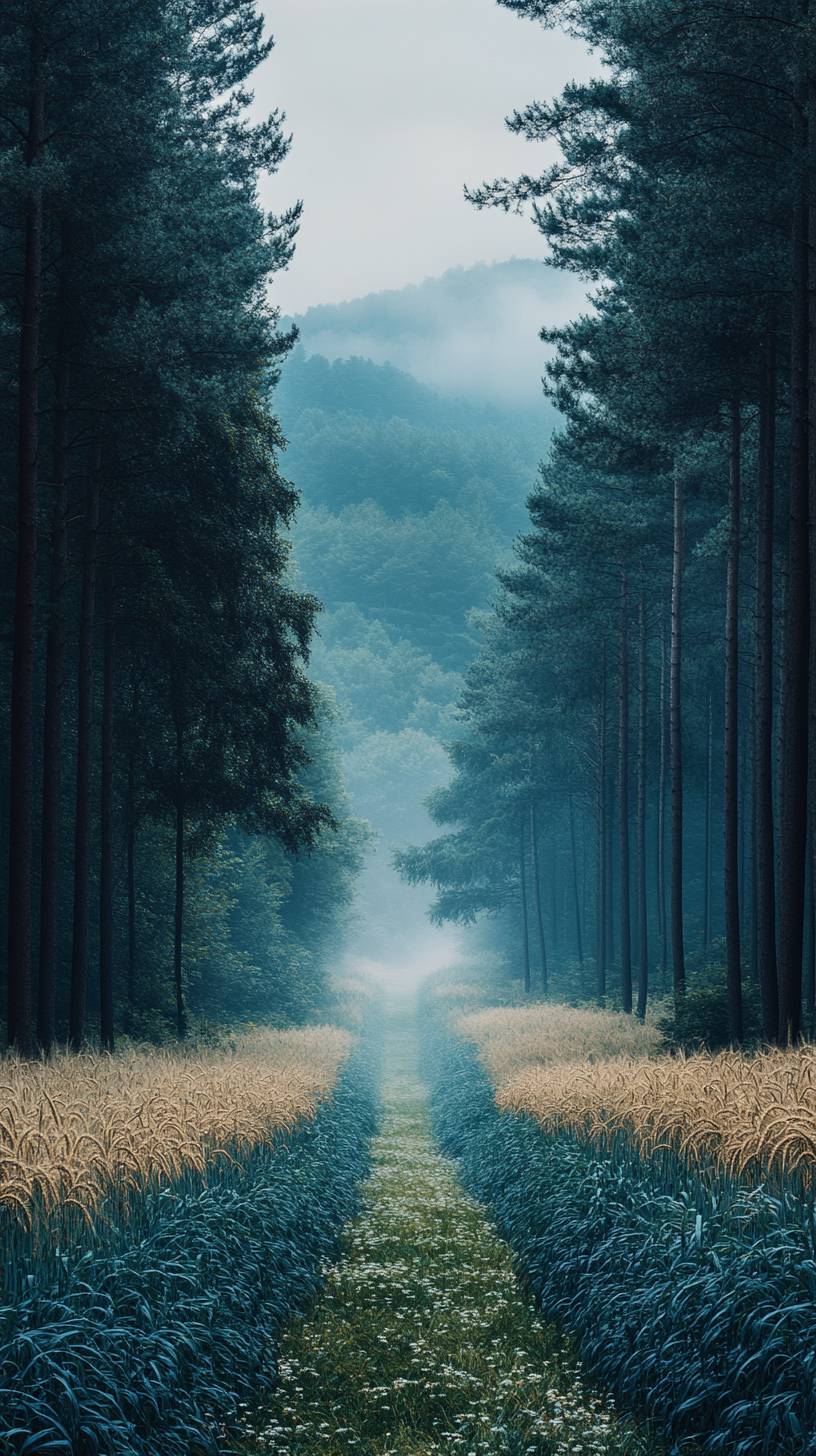 Generate an beautiful sea view by dense, dark blue trees on either side, leading towards a distant forest and hills. The sky is overcast with a soft blue-gray hue, creating a serene and slightly dramatic atmosphere. Animate the scene with a slow, sweeping drone effect starting from low over the wheat field, gradually rising higher to reveal more of the surrounding landscape. The wheat moves gently in the wind, and as the drone climbs, the full beauty of the forest and hills emerges, giving a peaceful, cinematic view of the scene.UHD, --chaos 20 --ar 9:16 --stylize 750 --v 6.1