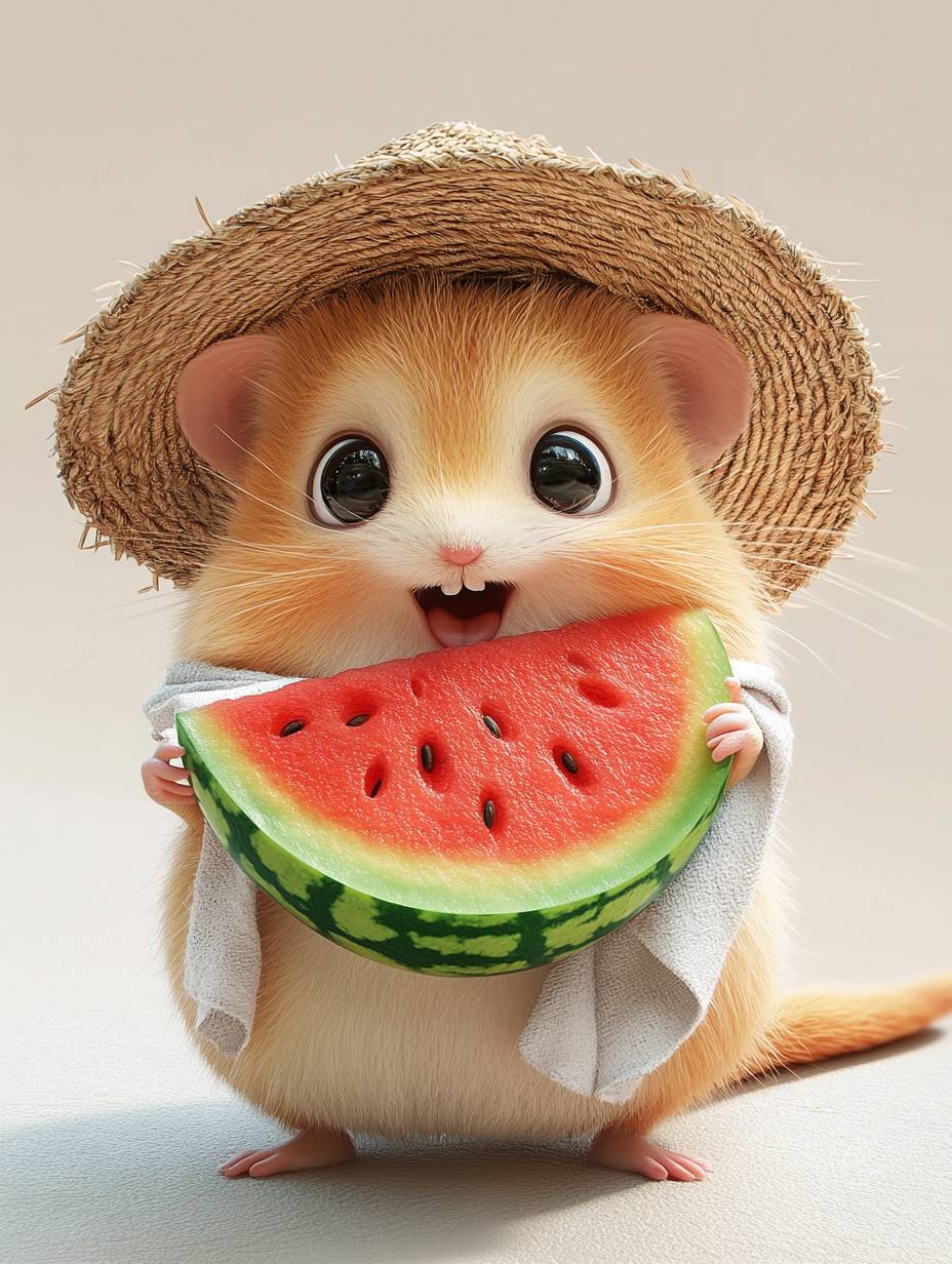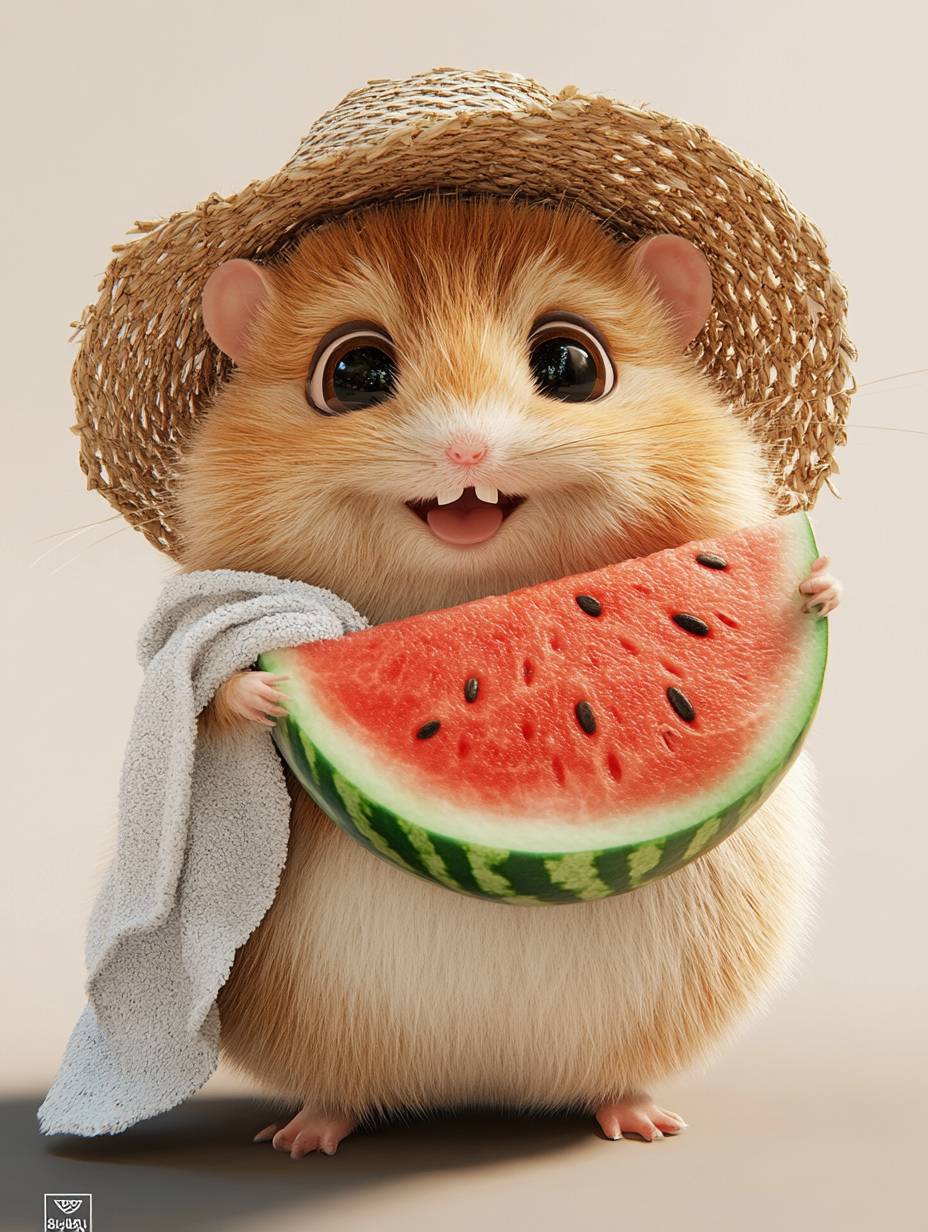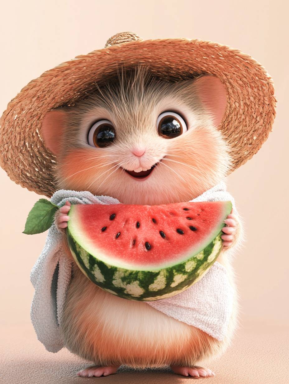 A cute and chubby hamster with fluffy fur and messy hair, soft and cute, wearing a straw hat, wrapped around a towel around its neck, holding a big watermelon in its hand, big eyes, full of wisdom, funny expression, Disney image, personified action, full body shot, hand drawn style, high-definition details, solid color background, 8k, skin texture deleted, 3D --ar 3:4 --v 6.1