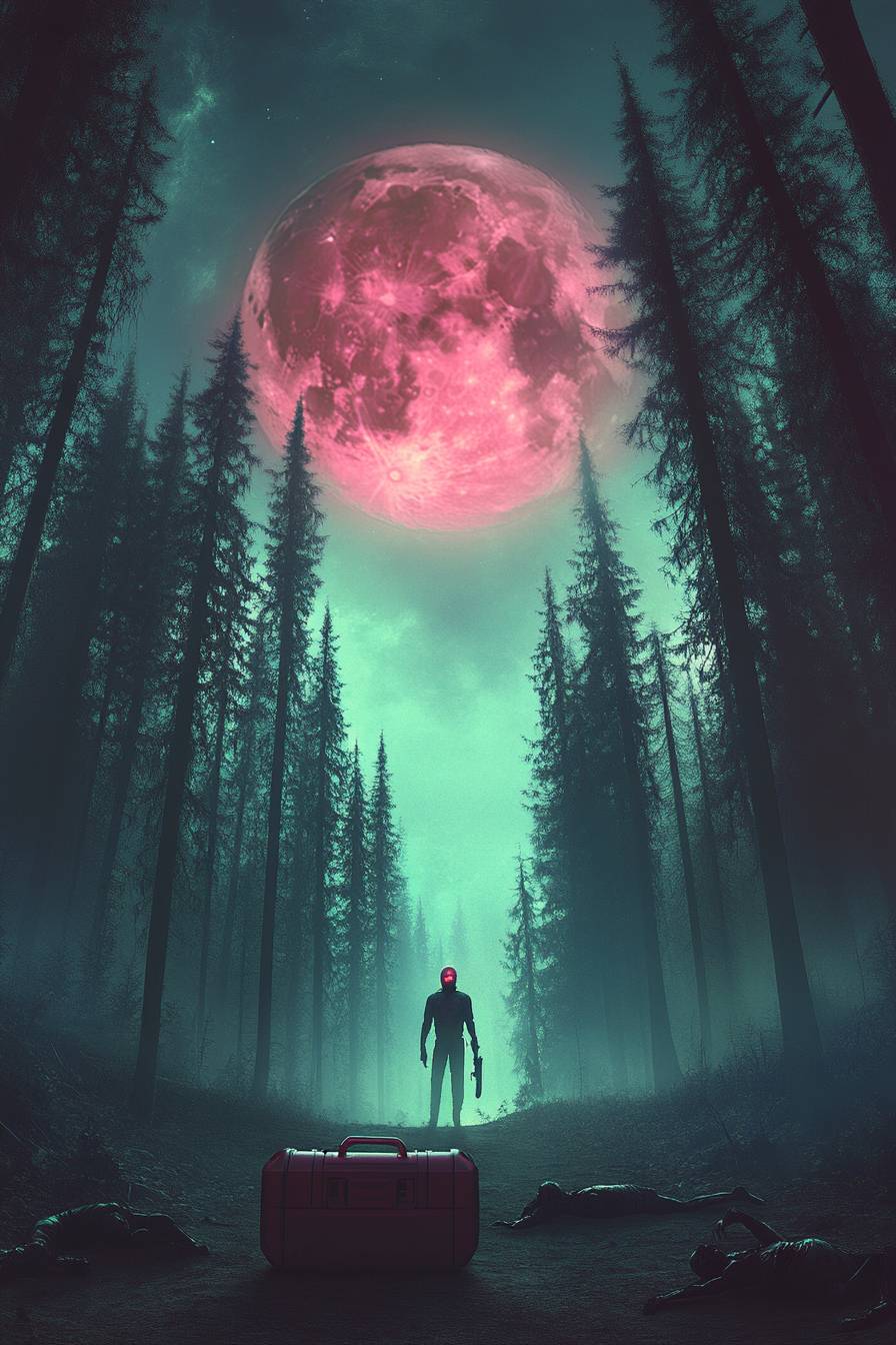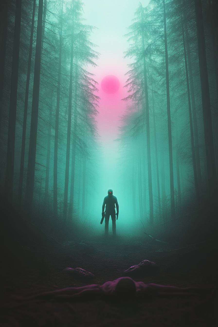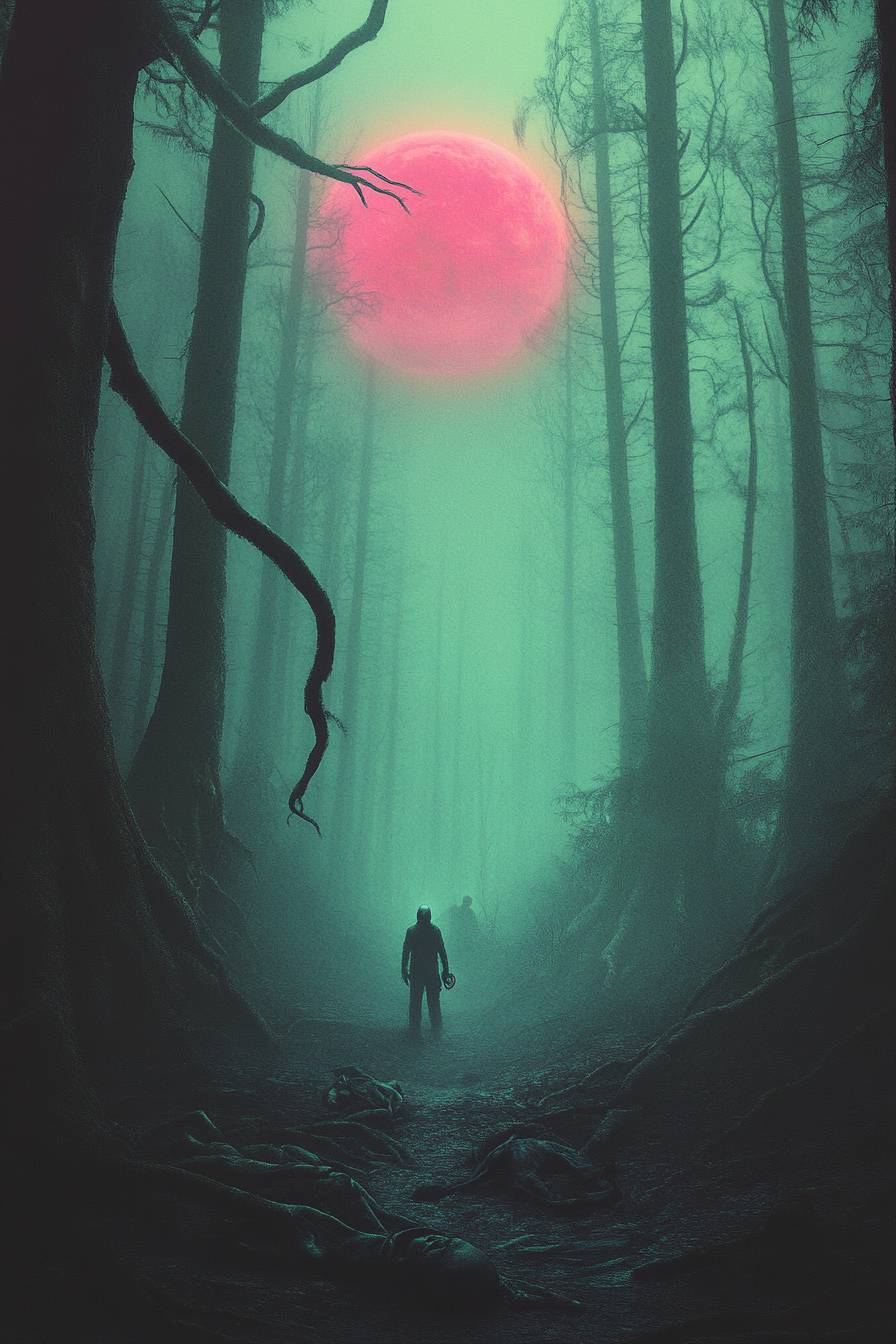 cinematic shot, Jason Voorhees is standing on the hill and holding an electric chainsaw, set a overcast forest scene, corps on the ground, eerie night with red moon --c 10 --ar 2:3 --style raw --sref 3420174183 --sw 120 --s 300 --p ndbewqk --v 6.1