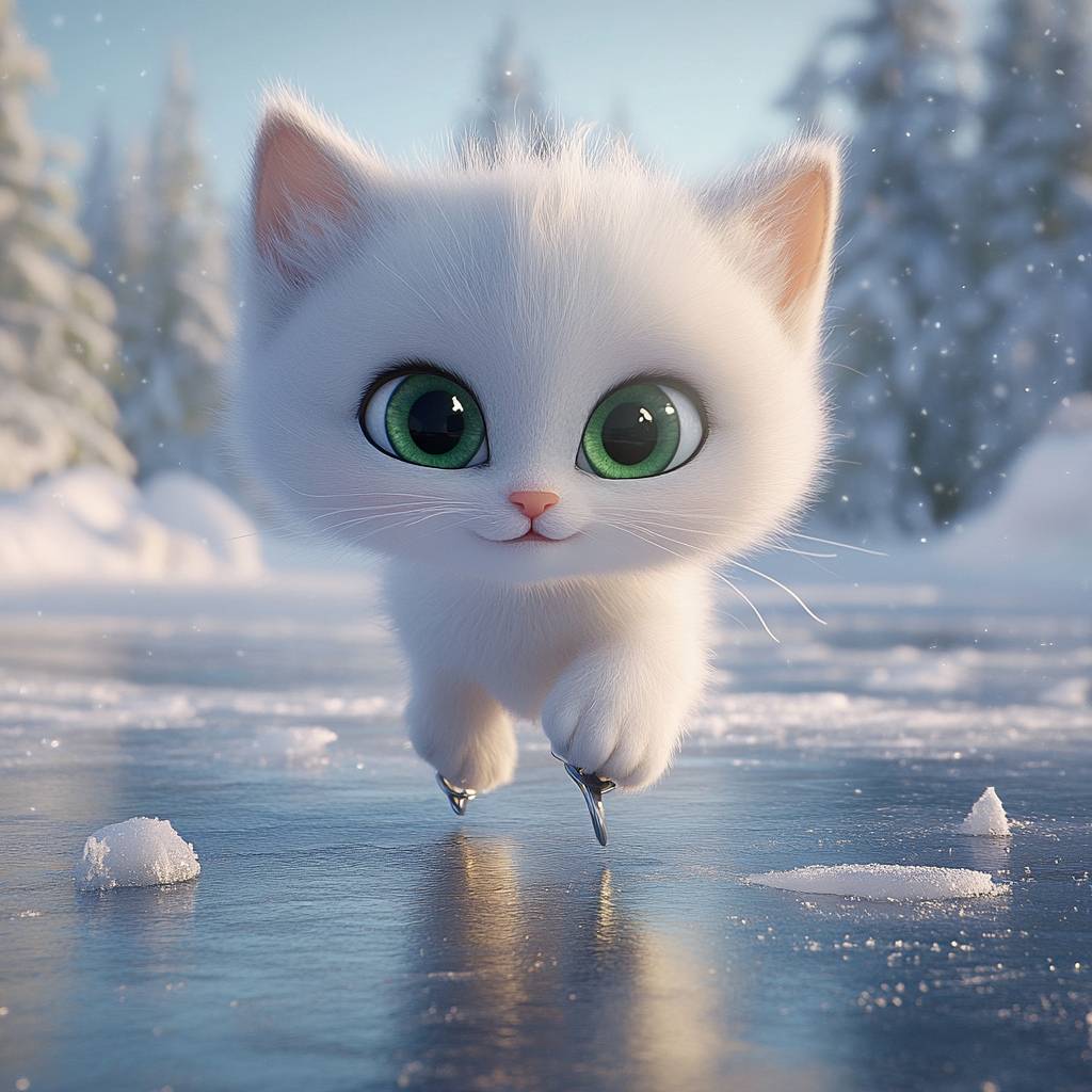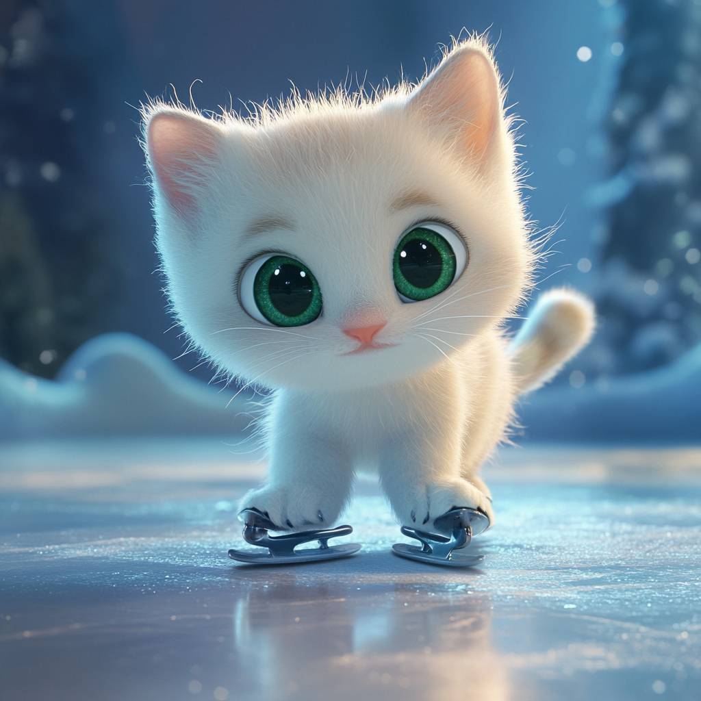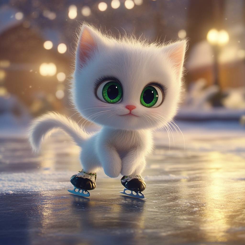 귀여운 랙돌 아기 고양이가 아름다운 초록색 눈으로 아이스 스케이팅을 하고 있는, 픽사 애니메이션, 8k