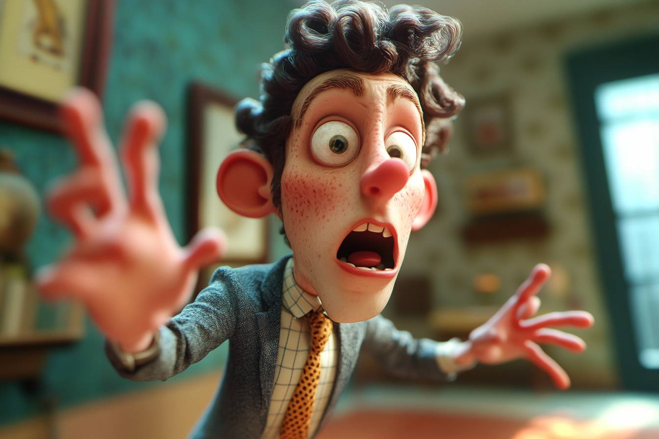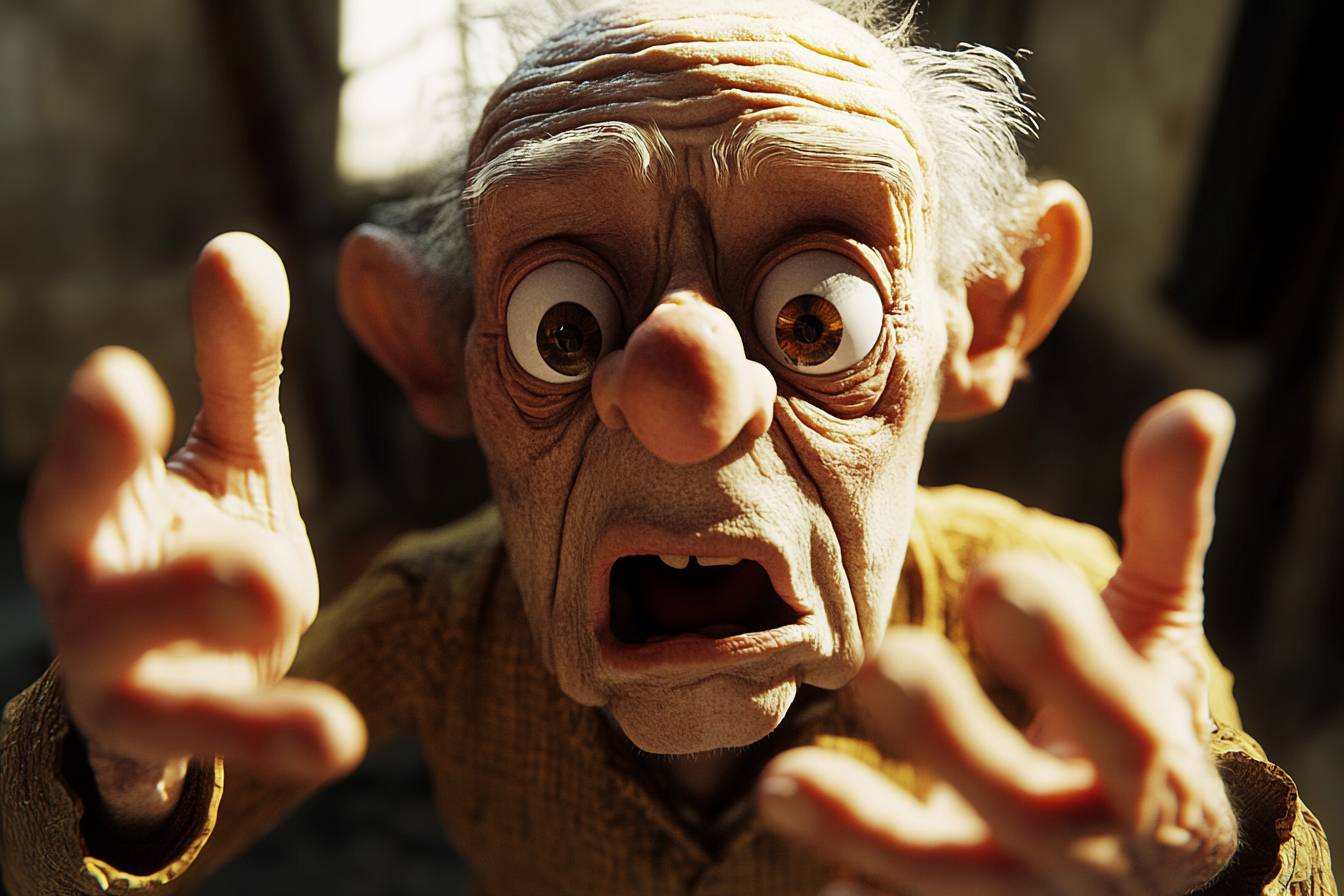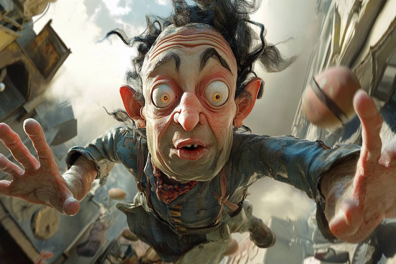 초현실적인 장면에서 세계와 상호작용하며 사실적인 요소와 과장된 만화 특성이 혼합되어 있습니다. 전경에는 아이코닉한 제스처를 취하고 있는 과장되었지만 사실적인 캐리커쳐의 클로즈업이 있습니다. 배경은 자연 조명, 그림자 및 심도와 함께 세밀하고 사실적인 텍스처를 특징으로 하며, 캐릭터들은 높아진 비율과 표정을 보여줍니다.