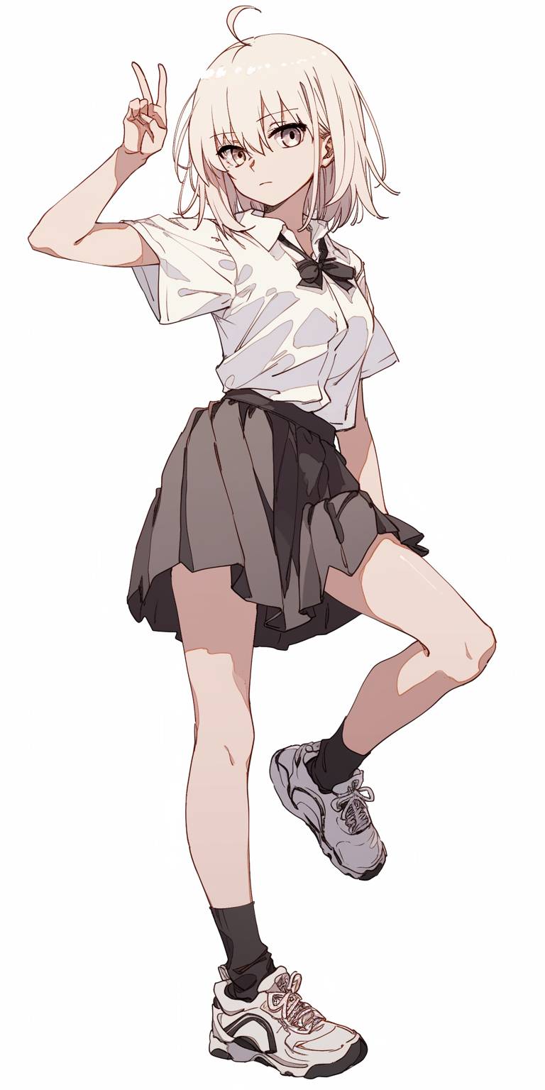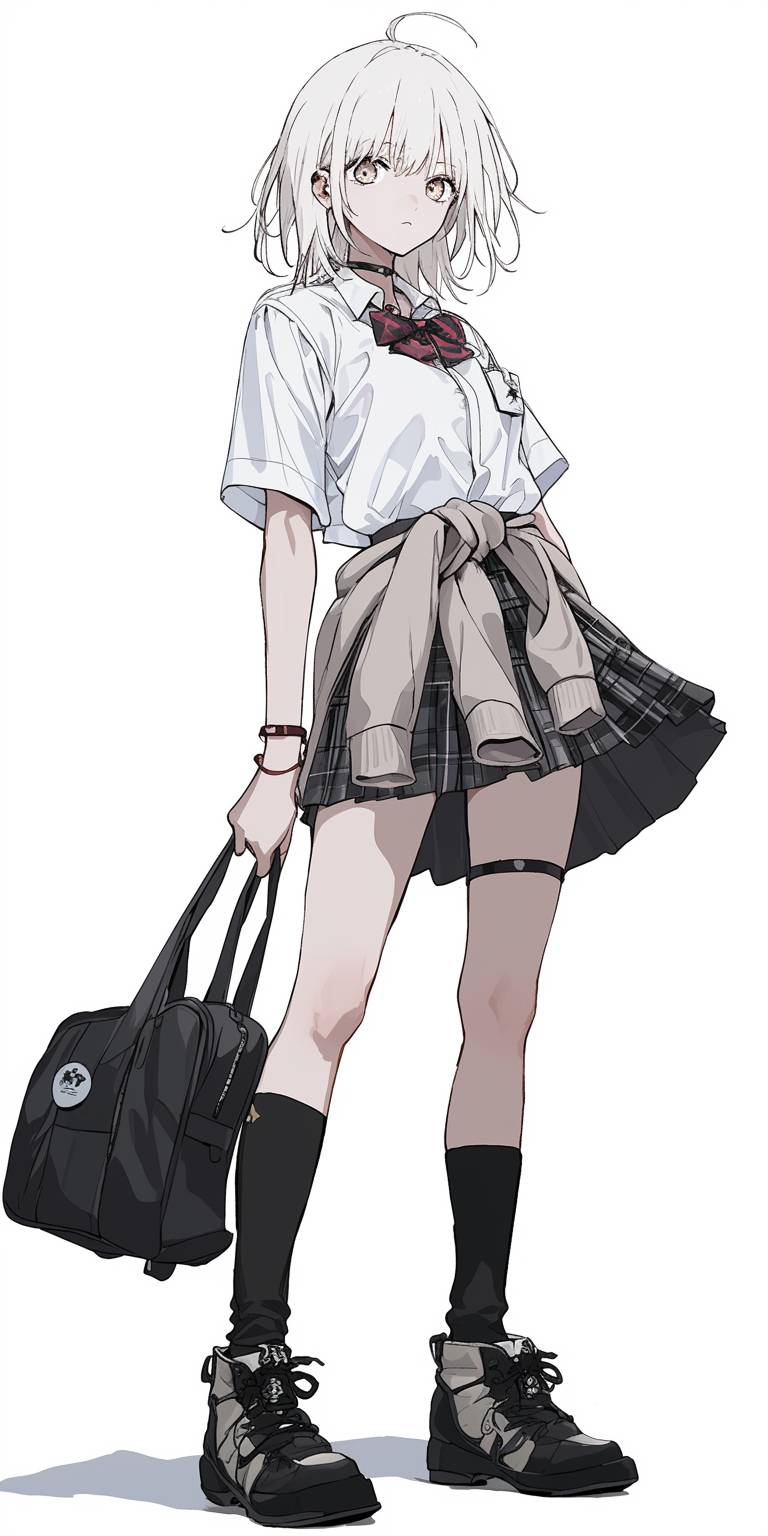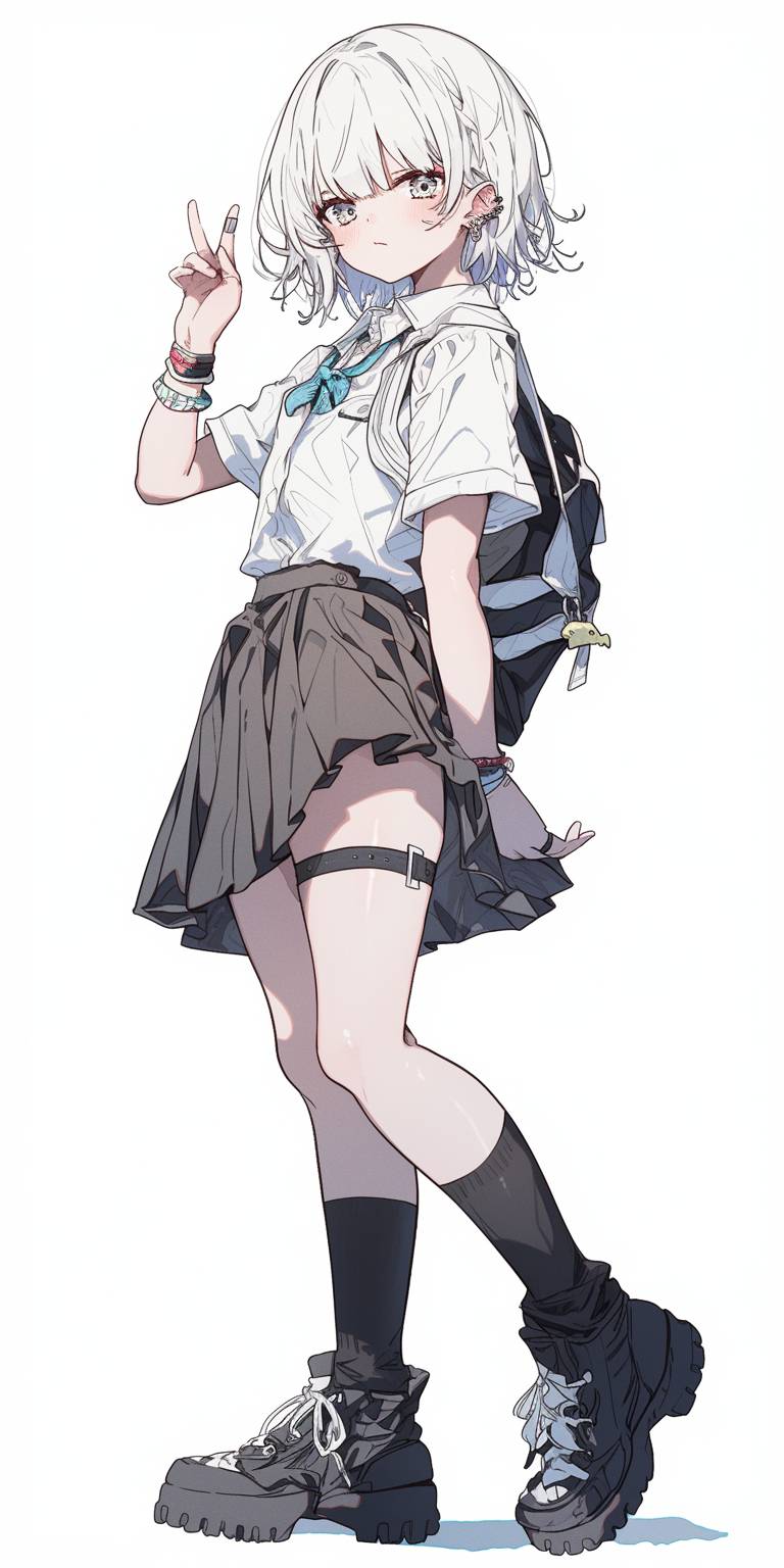 하얀 머리, 짧은 머리, 소년 같은, 고등학생, 흰 샤츠, 치마, 교복, 여름옷, 똑바로 서 있는, 짧은 소매, 흰색 배경, 고품질, 애니메이션, 전신, 서 있는 사진.